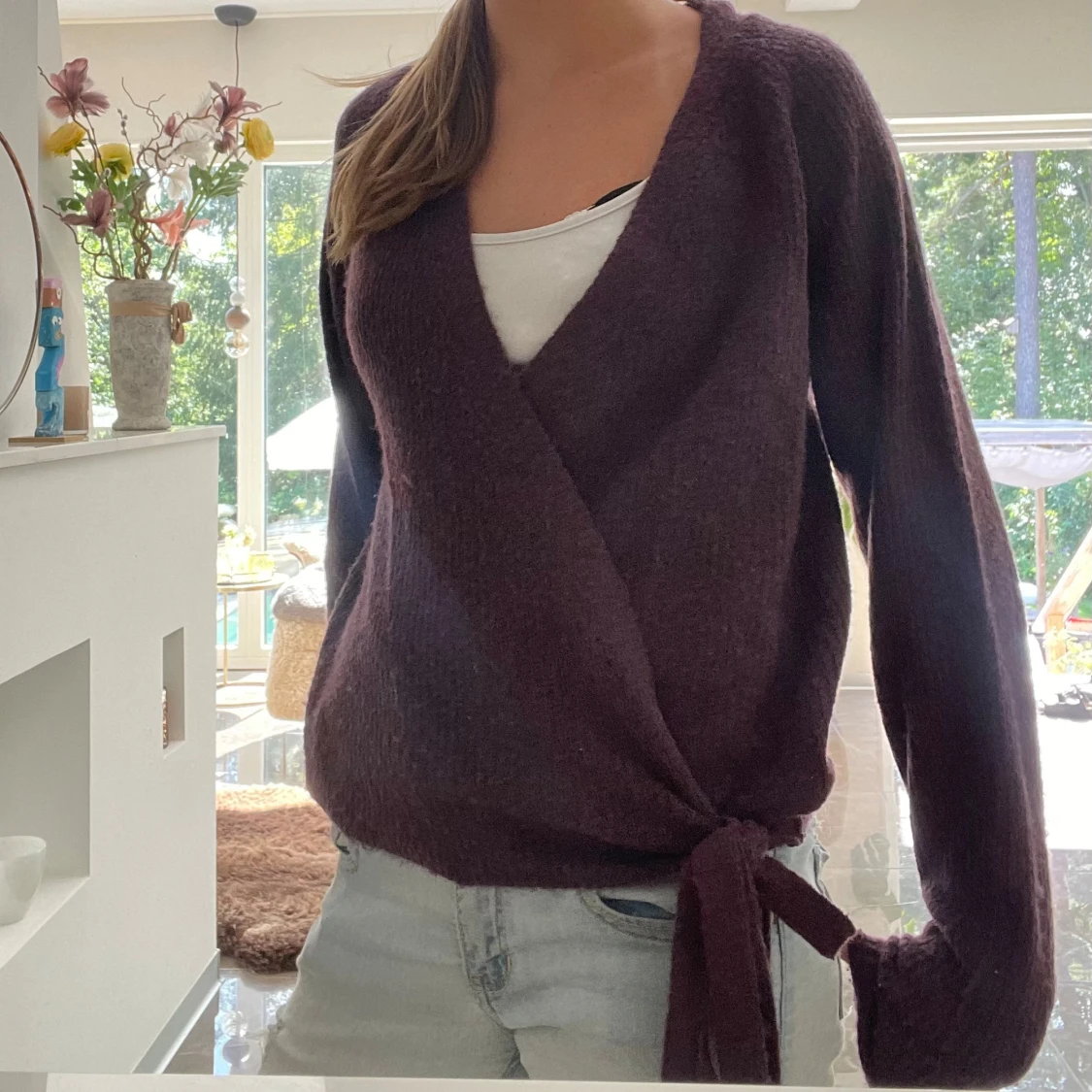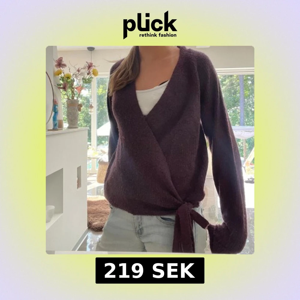Säljer en mysig mörklila omlottkofta med knyt i sidan. Koftan har långärmade och en djup v-ringning, perfekt att slänga på över ett linne. Materialet är stickat och känns mjukt mot huden. Passar dig som gillar chill och avslappnad stil.