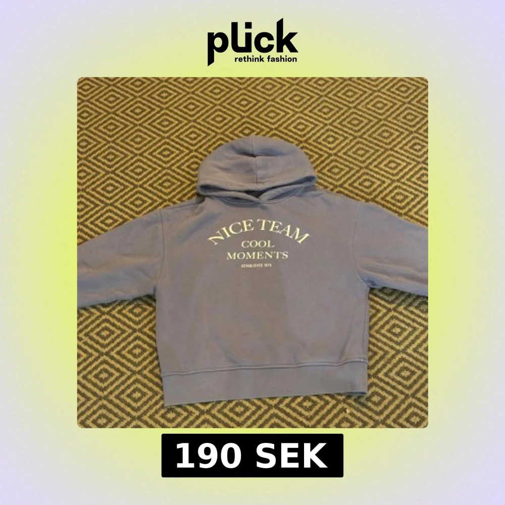 Säljer en lila/blåa hoodie med texten 'NICE TEAM COOL MOMENTS' tryckt på bröstet. Tröjan har huva och breda muddar vid ärmslut och nederkant. Perfekt för dig som gillar en avslappnad och cool stil.