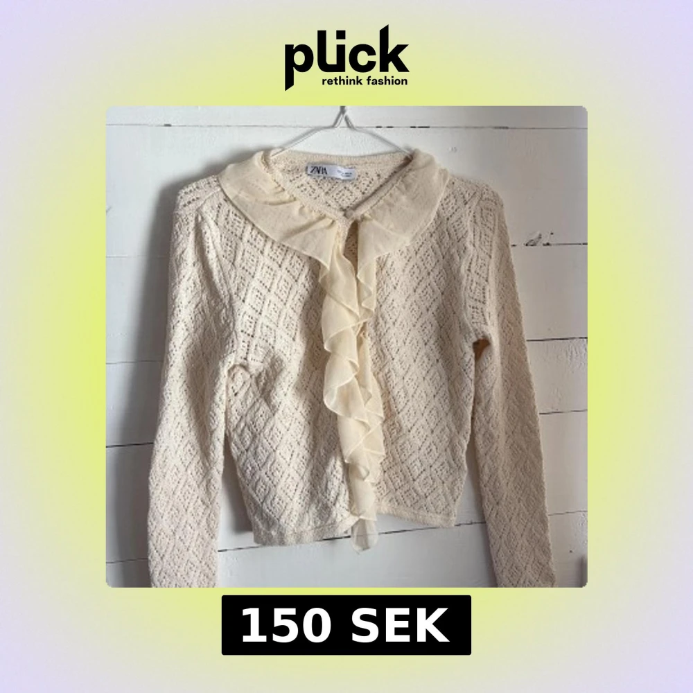 Supersöt beige stickad kofta från Zara med lång ärm och stor volangkrage framtill. Koftan har ett diskret hålmönster och en romantisk känsla med volangdetalj längs knäppningen. Perfekt att styla till både jeans och kjol.