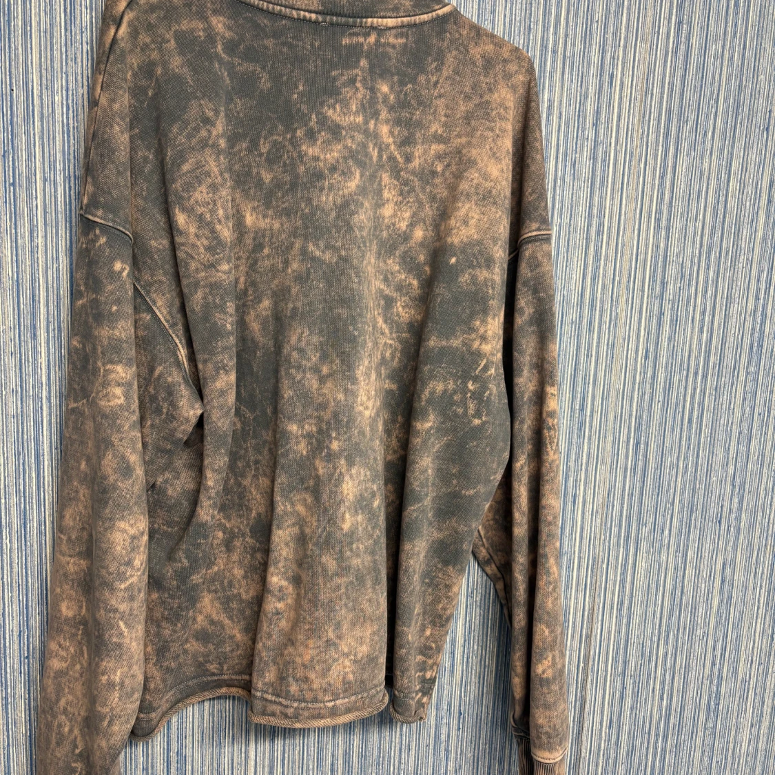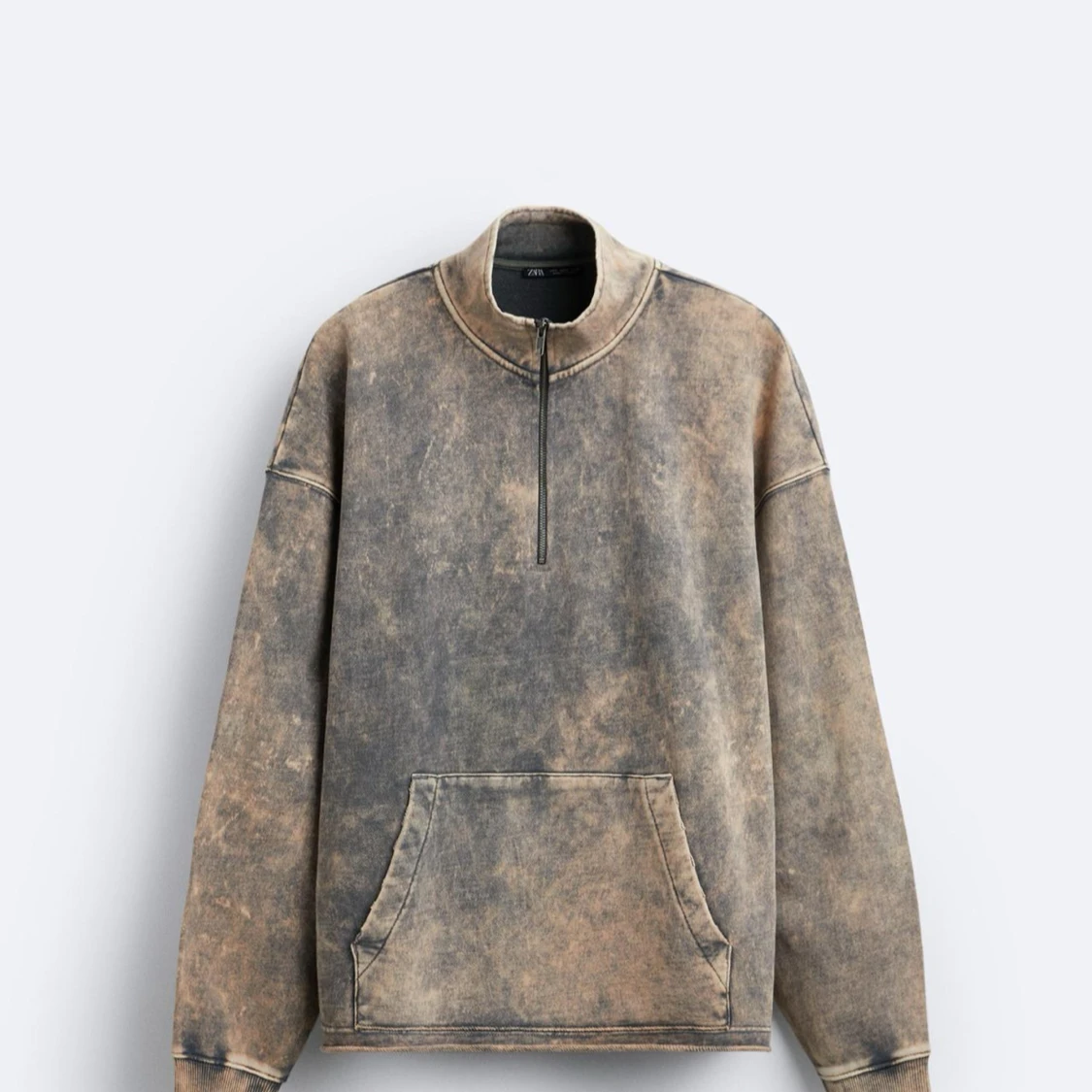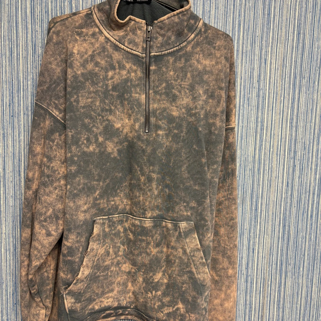 Säljer en unik brun och grå hoodie med dragkedja och stor ficka framtill. Tröjan har en avslappnad passform och är perfekt för en cool och bekväm stil. Den har långa ärmar och en hög krage med dragkedja. Storlek M