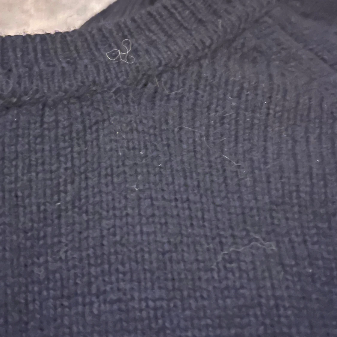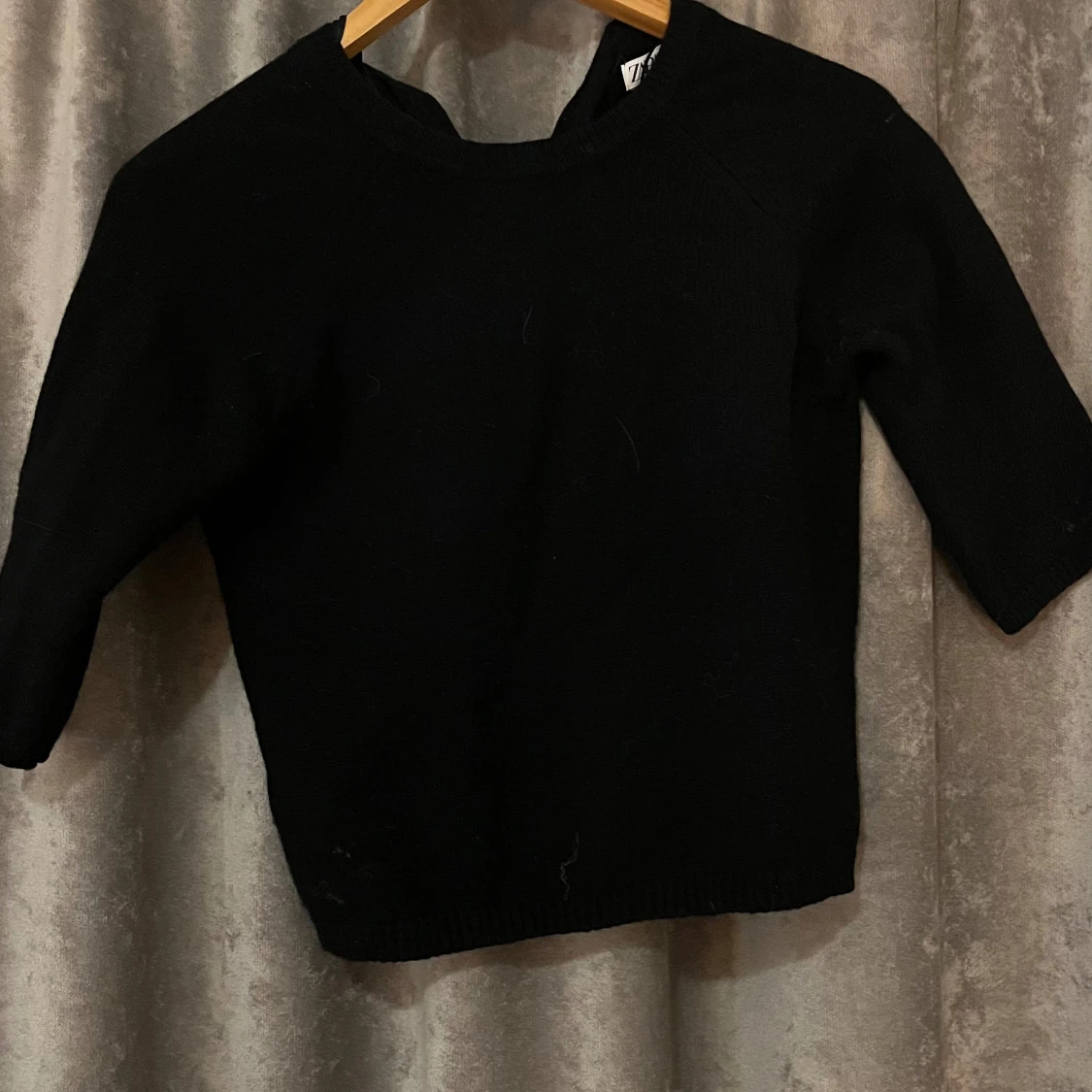 Säljer en mörkblå stickad topp med trekvartsärm. Perfekt för en stilren look och passar bra till både jeans och kjol. Tröjan har en enkel design med rund hals och är bekväm att bära.