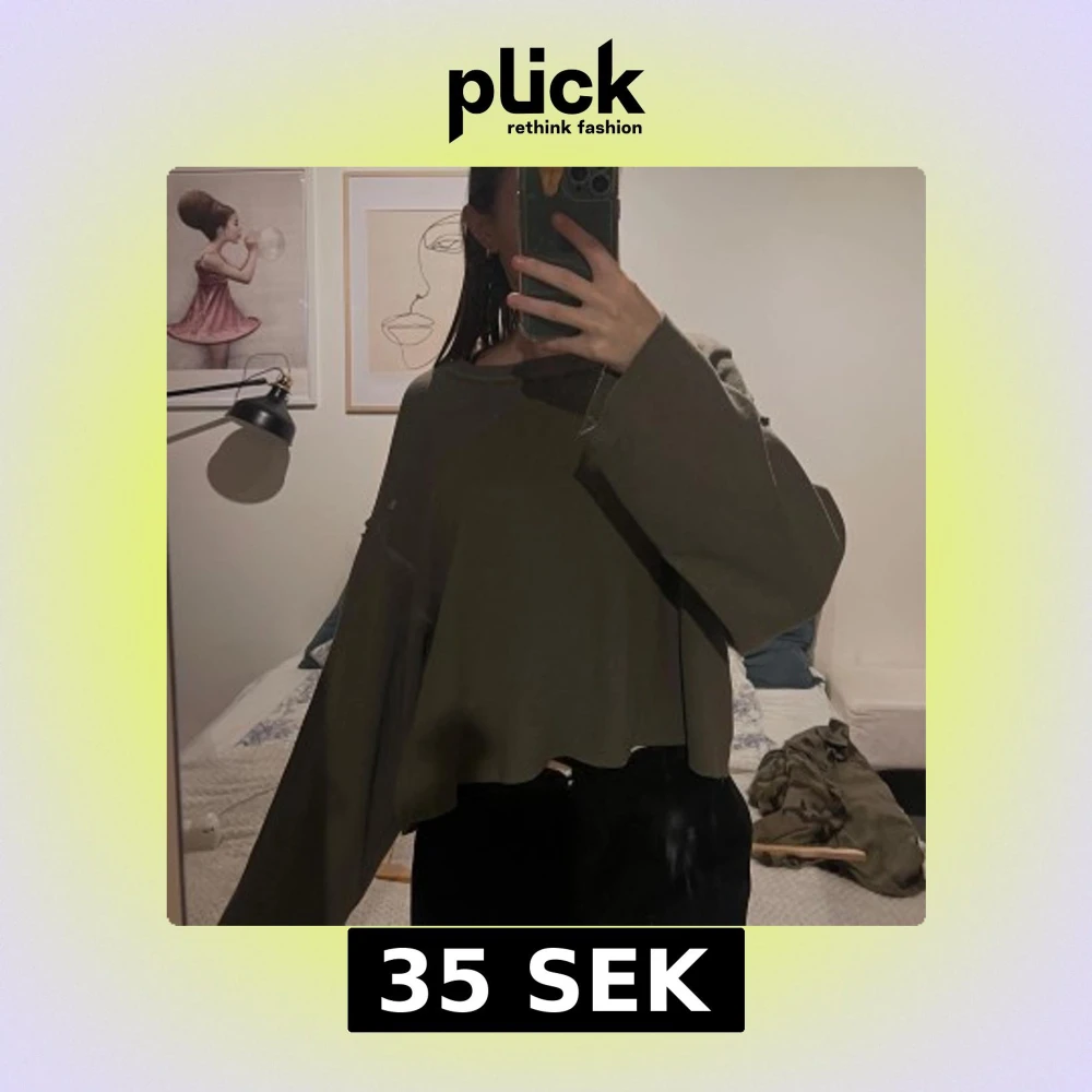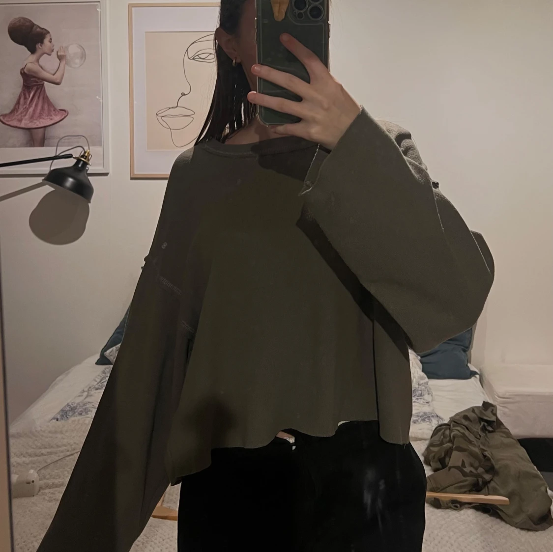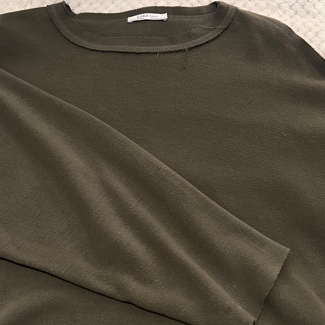 Säljer en olivgrön croppad tröja från Zara. Tröjan har långa ärmar och en avslappnad passform. Bra skick!