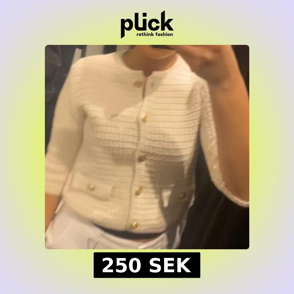 Säljer en vit, ribbad kofta med snygga guldknappar framtill och två dekorativa fickor.
