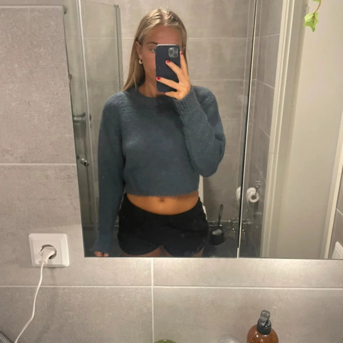 En blå stickad tröja från Zara med långa ärmar och en ribbad rund halsringning. Tröjan har en croppad passform och är tillverkad i ett mjukt och bekvämt material.