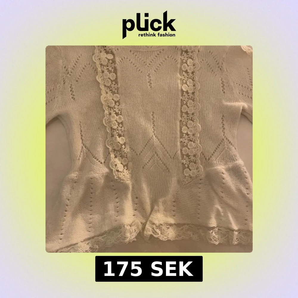 Säljer en söt vit stickad tröja från Zara med vackra spetsdetaljer framtill och vid fållen. Tröjan har ett fint mönster, perfekt för en romantisk look. Passar bra till både jeans och kjol!