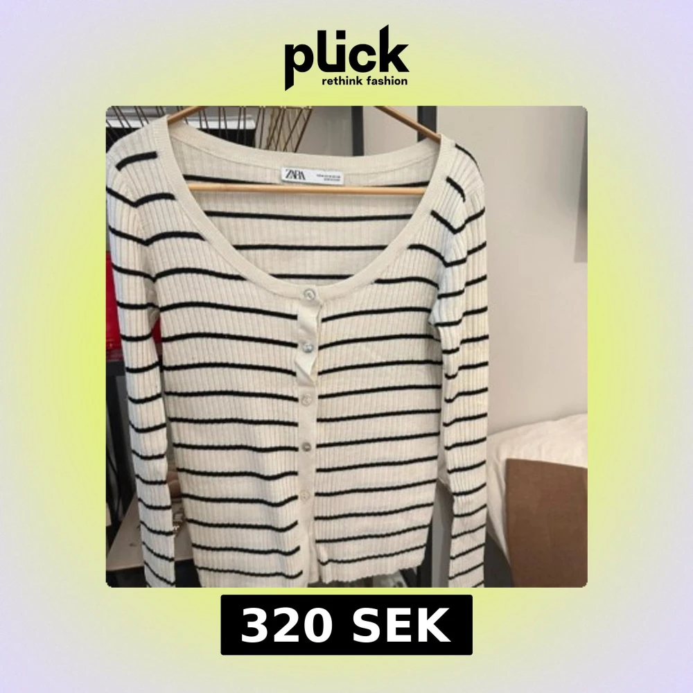 Säljer en vit ribbad kofta från Zara med svarta ränder. Koftan har långa ärmar, knappar framtill och en smickrande, något djupare ringning. Perfekt att slänga över en topp eller bära som den är. Passar även mig som är en storlek S. Knappt buren.