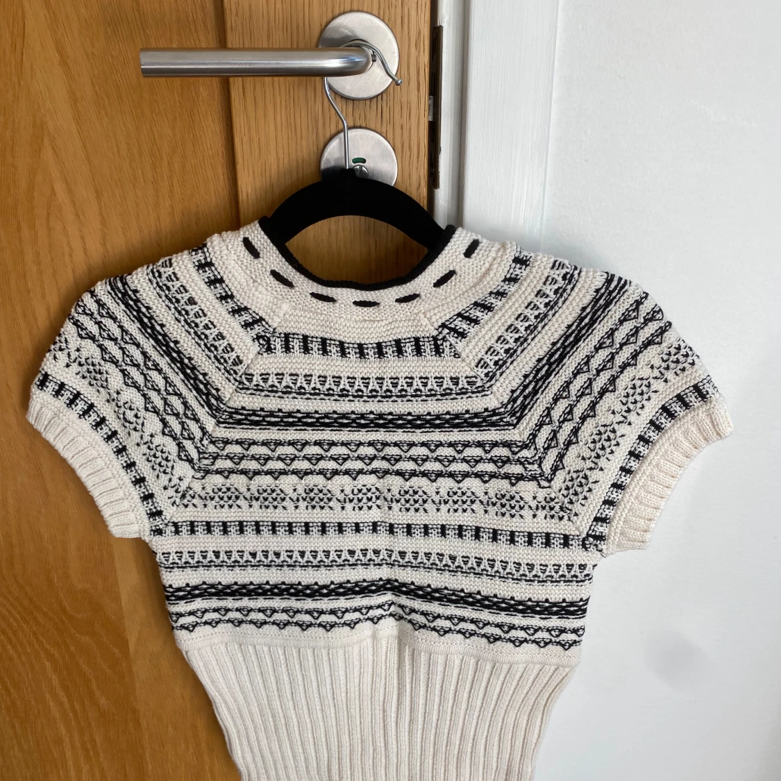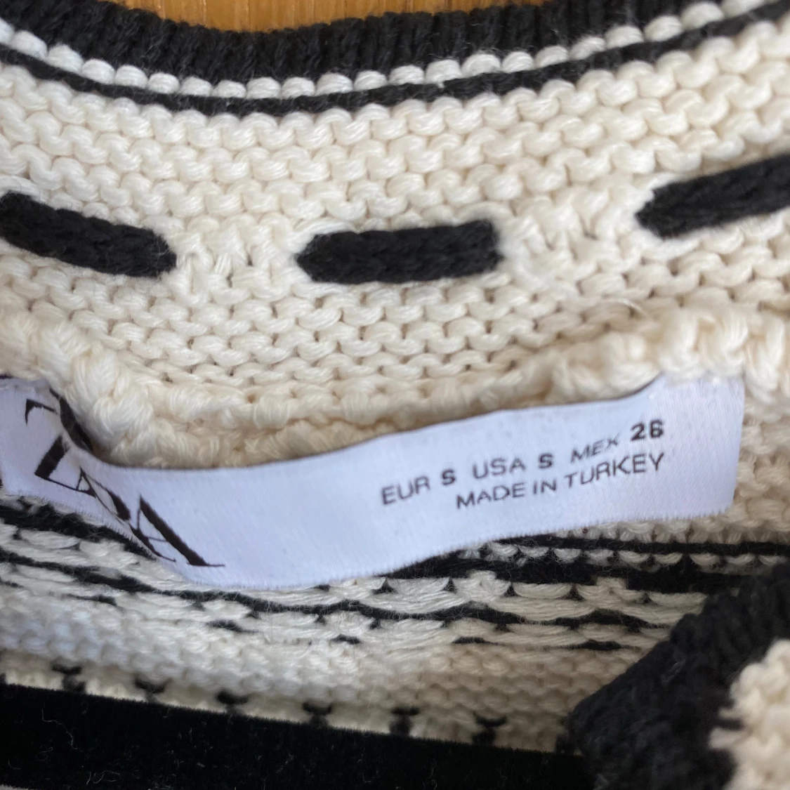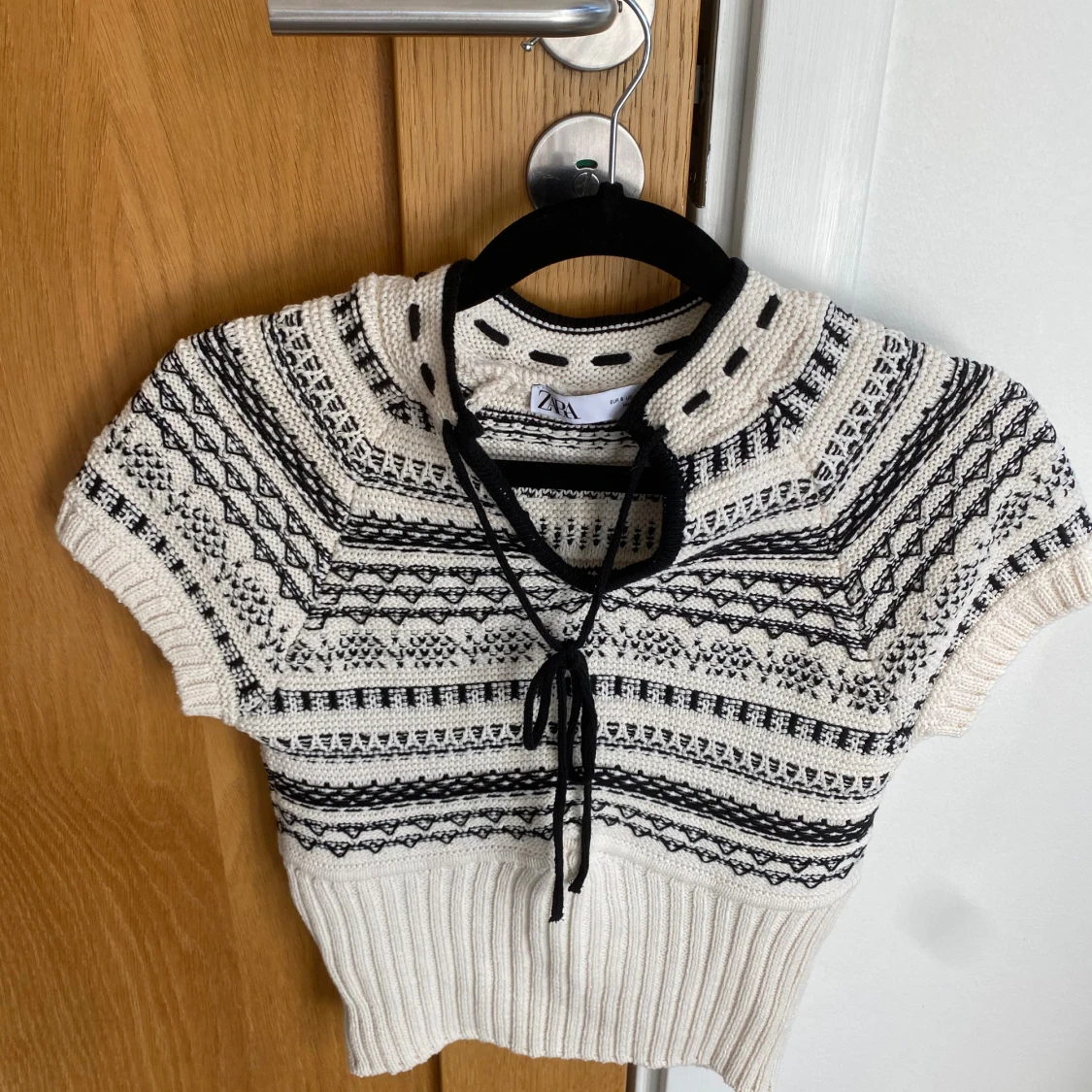 Supersöt stickad topp från Zara i vitt med svarta detaljer och mönster, aldrig använd, som ny!Kortärmad modell med rund hals och dekorativ knytning framtill. Perfekt att styla med jeans eller kjol för en trendig look.
