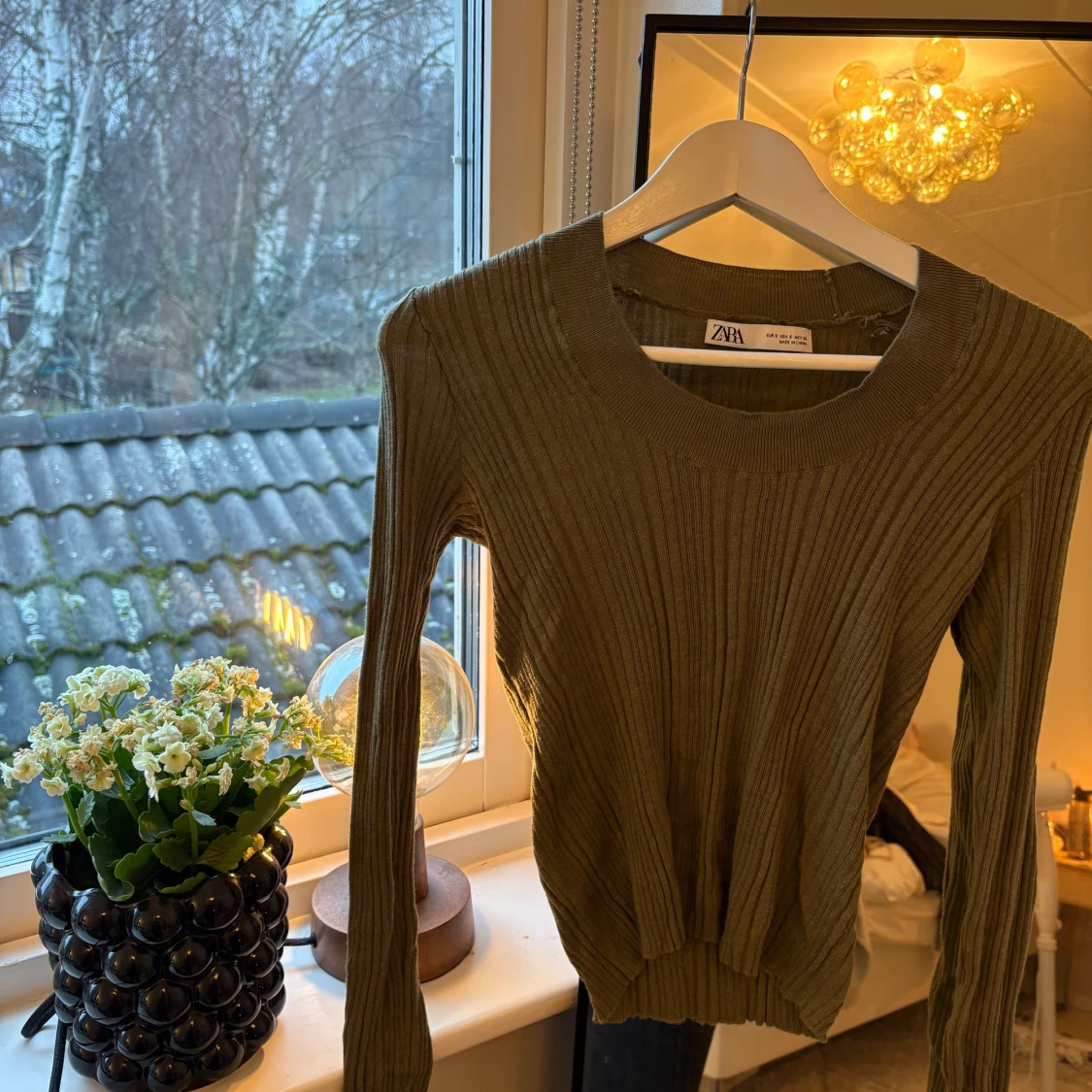 Säljer en snygg olivgrön ribbad tröja från Zara. Den är i mycket bra skick och har en skön passform med långa ärmar. Otroligt skönt material!