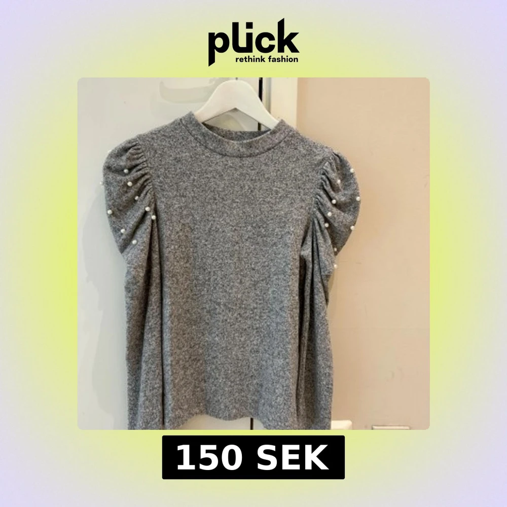 Supersnygg grå stickad tröja med puffiga långärmar dekorerade med pärlor längs rynkningen. Tröjan har en rund hals och mjukt material som känns skönt mot huden. Perfekt för dig som gillar stilrena detaljer och vill ha något extra till din outfit.