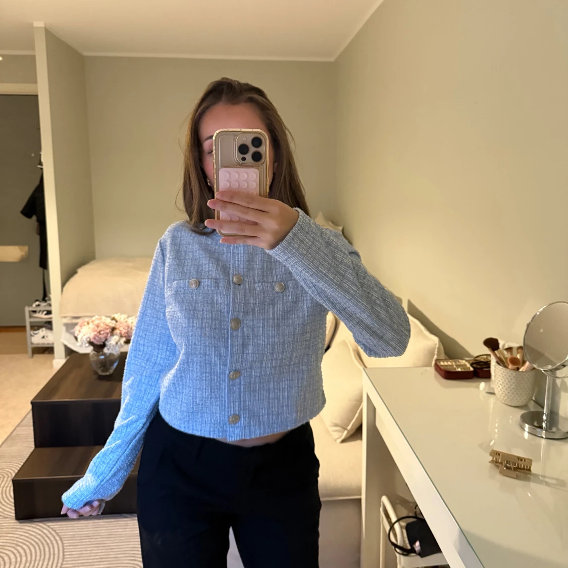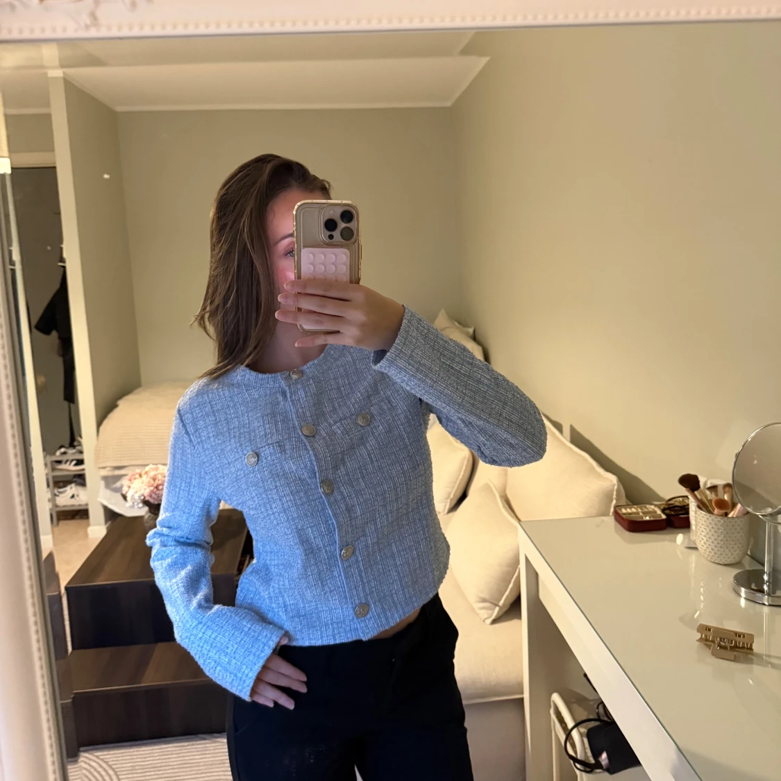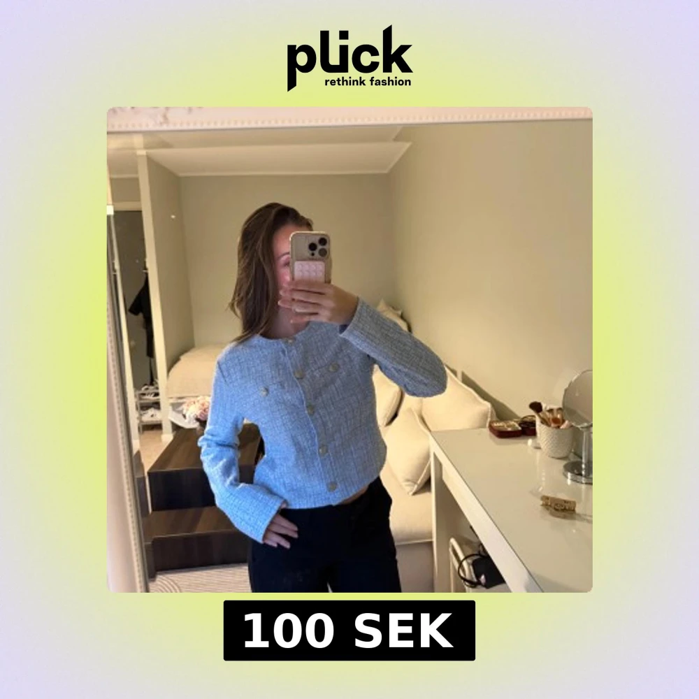 Säljer en ljusblå croppad kofta med ribbad struktur och snygga guldfärgade knappar framtill. Koftan har lång ärm och rund hals, samt dekorativa fickor med knappar på bröstet. Kan även användas som en kofta