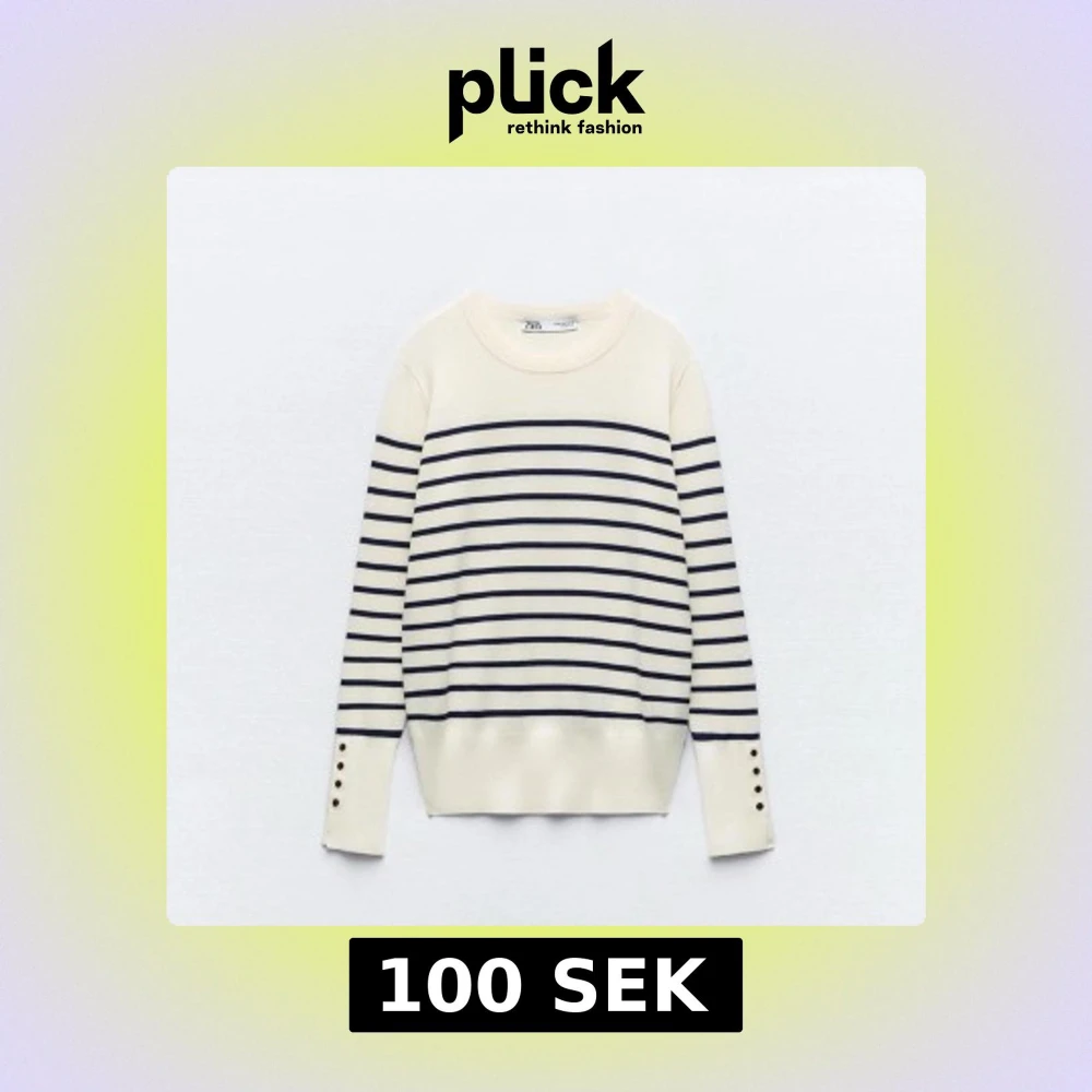Snygg vit tröja med marinblå ränder från Zara. Tröjan har långärmade ärmar med dekorativa knappar vid mudden och en rund halsringning. Endast använd ett fåtal gånger, som ny.