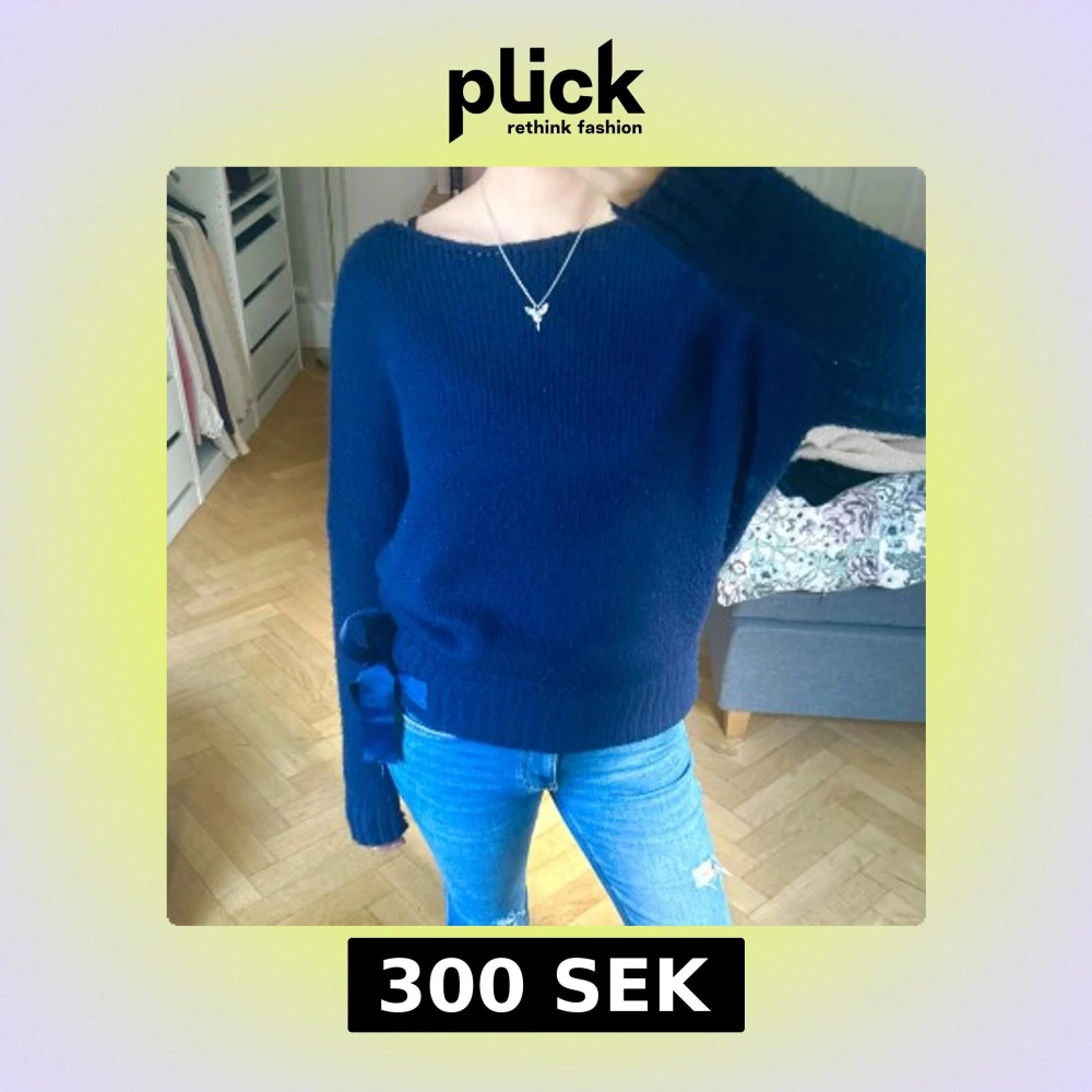 Snygg mörkblå stickad tröja från Quiosque i storlek 36/38. Tröjan har långärmad design och en bred halsringning. På ena ärmen sitter en cool rosettdetalj som ger extra stilpoäng. Perfekt att matcha med jeans för en chill look.