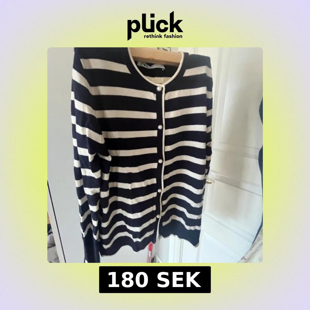 Säljer en stilren randig kofta i svart och vit med knappar framtill. Koftan har långa ärmar och en klassisk rund halsringning. Perfekt för en avslappnad men ändå chic look. Den är storlek L men super lite i storleken så passar mig som är en S