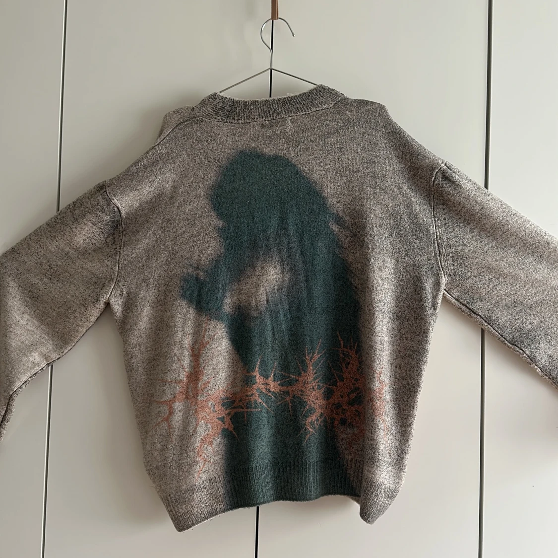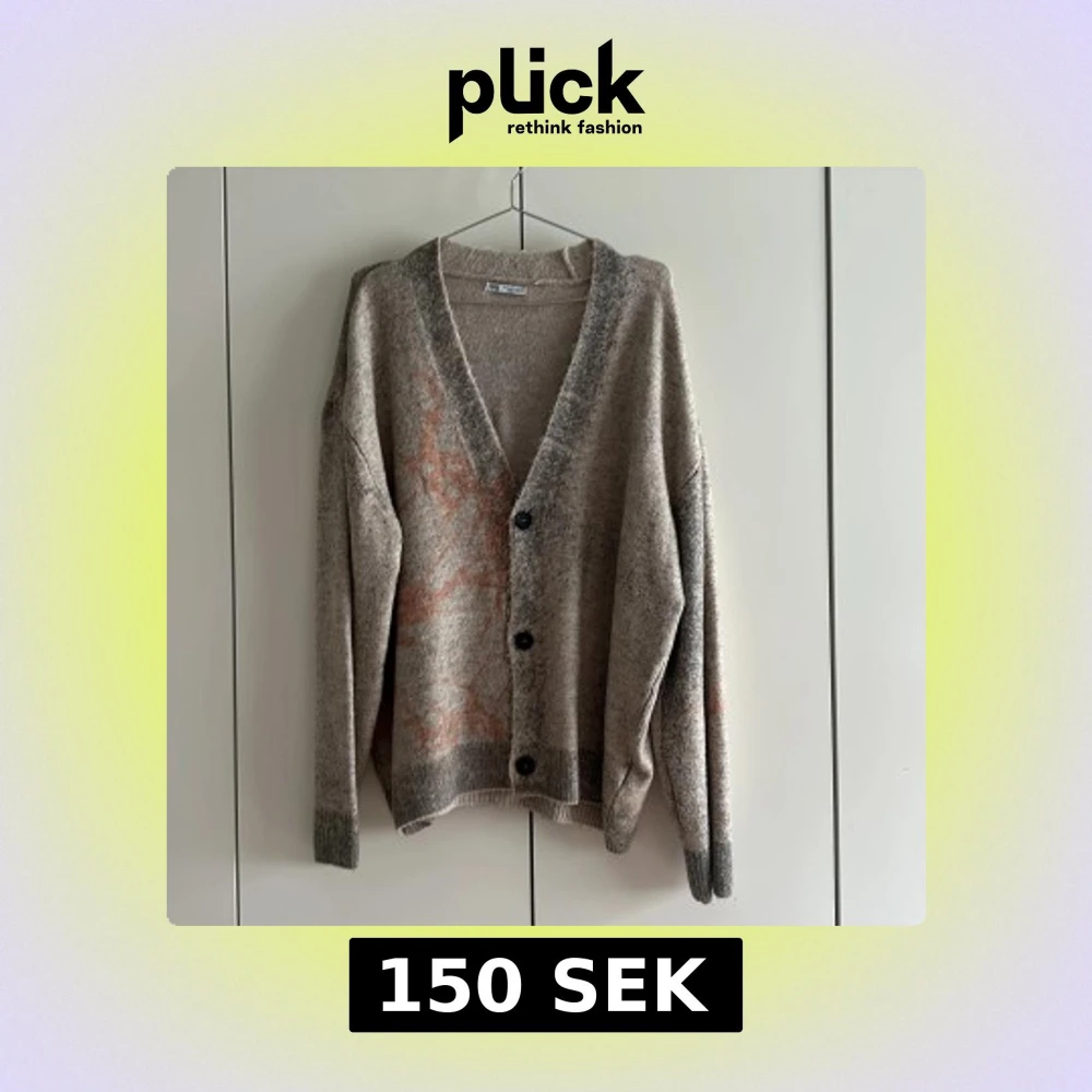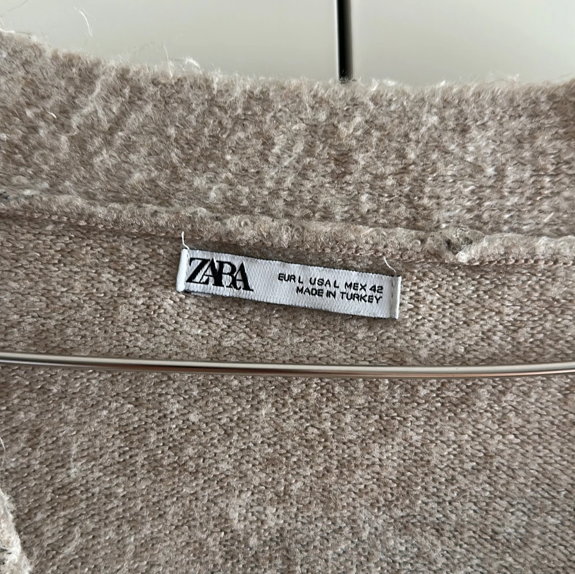 Säljer en beige kofta från Zara med unikt tryck i grönt och rostbrunt på ryggen och framsidan. Koftan har v-ringning, knappar framtill och långa ärmar. Materialet är mjukt och stickat, perfekt för lager-på-lager under kyliga dagar.