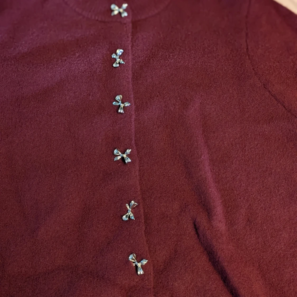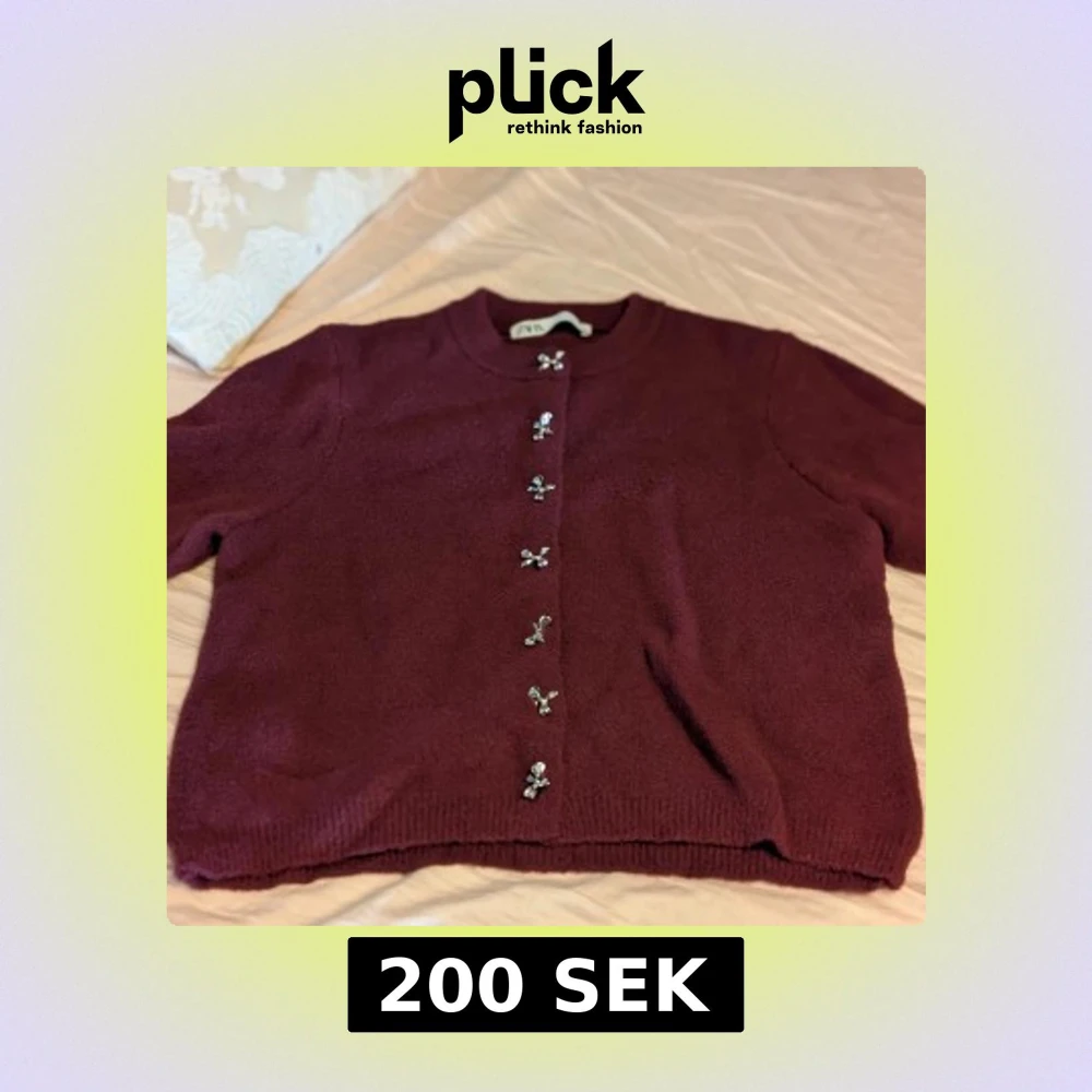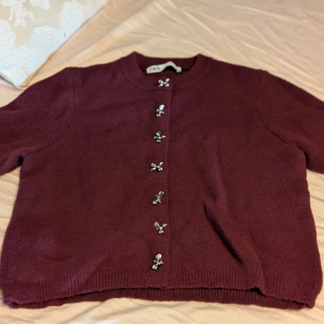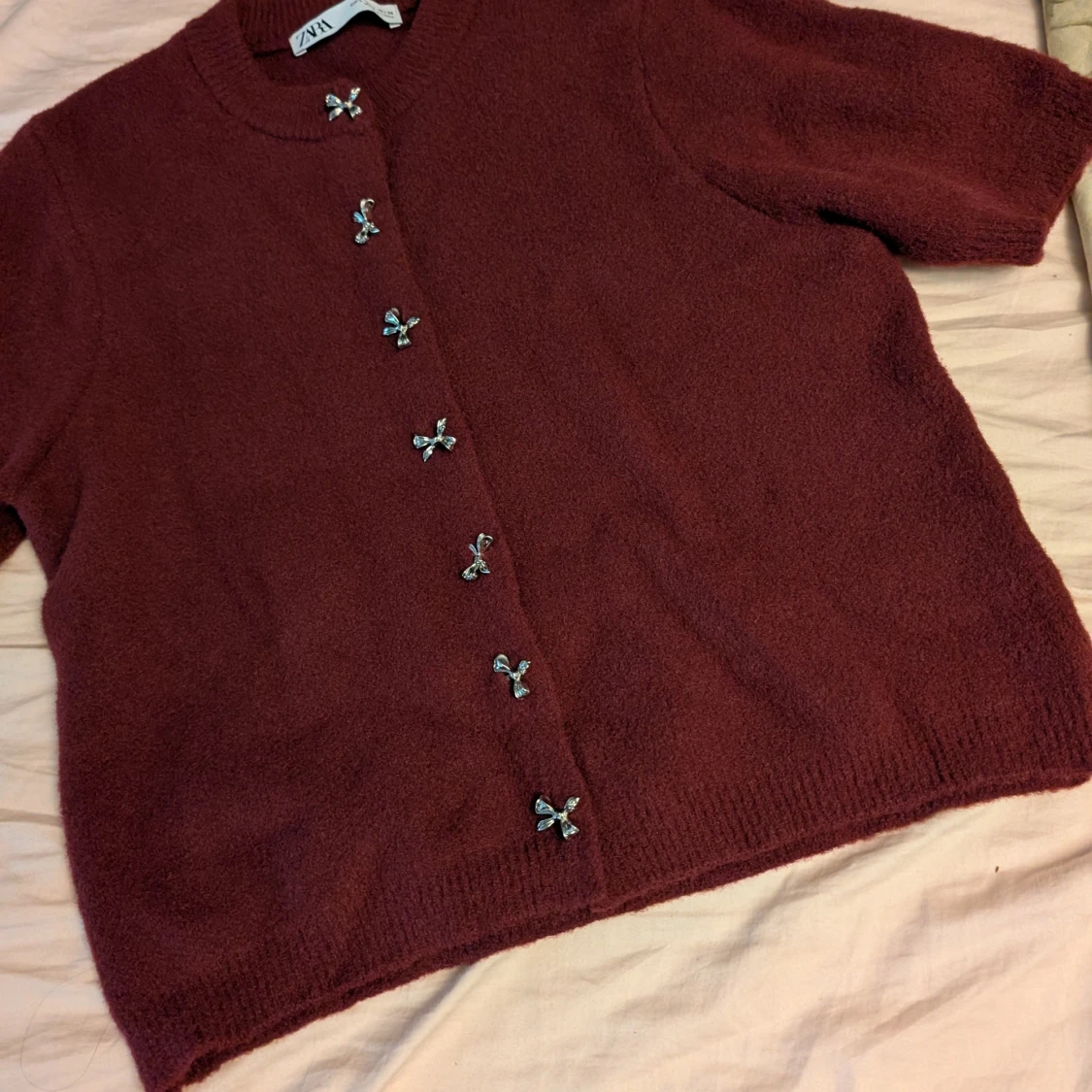 Superfin vinröd kofta från Zara med korta ärmar och söta silvriga rosettformade knappar framtill. Koftan är stickad och har en mjuk, mysig känsla. Perfekt för lager-på-lager och att lyfta din outfit med en unik detalj.