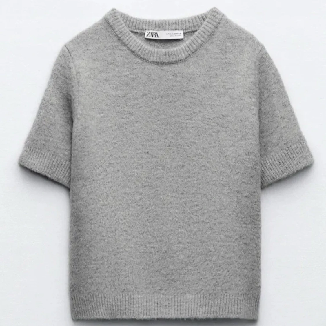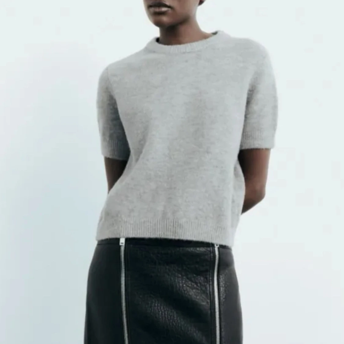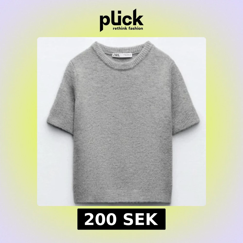 Säljer en stilren grå tröja från Zara. Den är kortärmad och har en rund halsringning. Perfekt för en avslappnad look. Tröjan är mjuk och bekväm att bära.