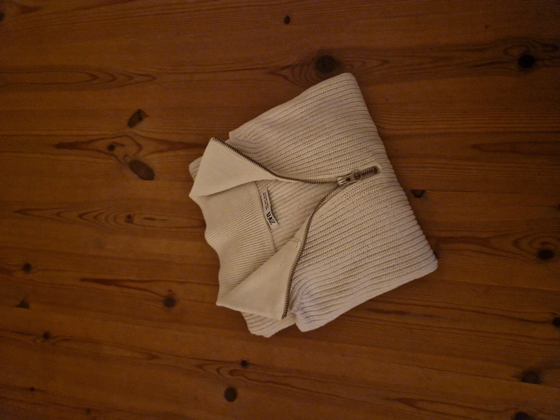 En vit zara kofta half zip, använd men i bra skick. Säljs för att den inteblänhre används, jag är 180 och den passar bra. Det är storlek L men det är spanska storlekar så i sverige är det M