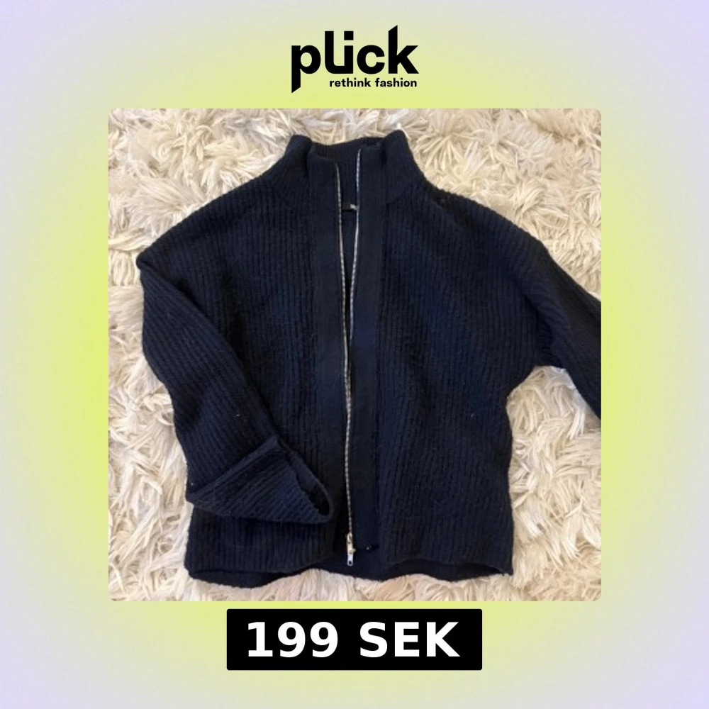 Mysig mörkblå stickad kofta från 157 med grov struktur och hel dragkedja framtill. Hög krage och långa ärmar ger en chill vibe. Perfekt att slänga på sig när det är kyligt ute.