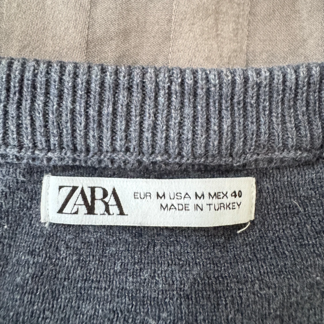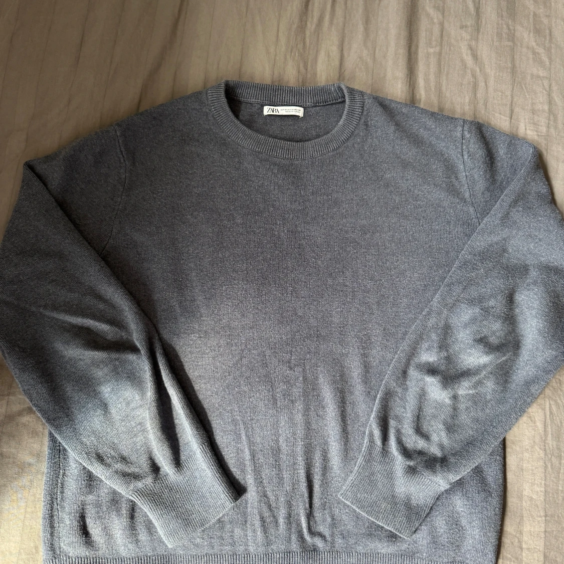 Säljer en stilren grå stickad tröja från Zara i storlek M. Tröjan har rund halsringning, ribbade muddar och är långärmad. Perfekt för lager-på-lager och funkar till både jeans och chinos.