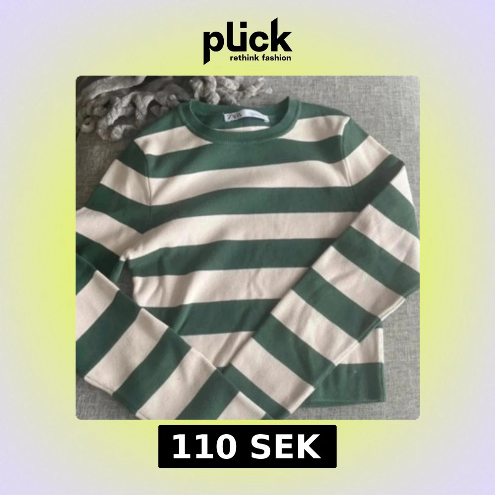 Säljer en snygg randig tröja från Zara i grönt och vit. Tröjan har långa ärmar och en rund halsringning, perfekt för en avslappnad stil. Passar bra till jeans eller kjol!