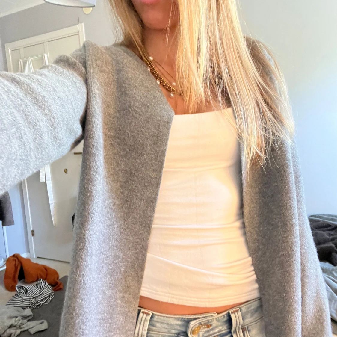 Säljer en enkel och stilren grå kofta med öppen front. Koftan är långärmad och går även att knäppa. perfekt att slänga över en topp eller t-shirt. Storleken är M men är ganska liten så passar en xs/s också. Skriv för fler bilder