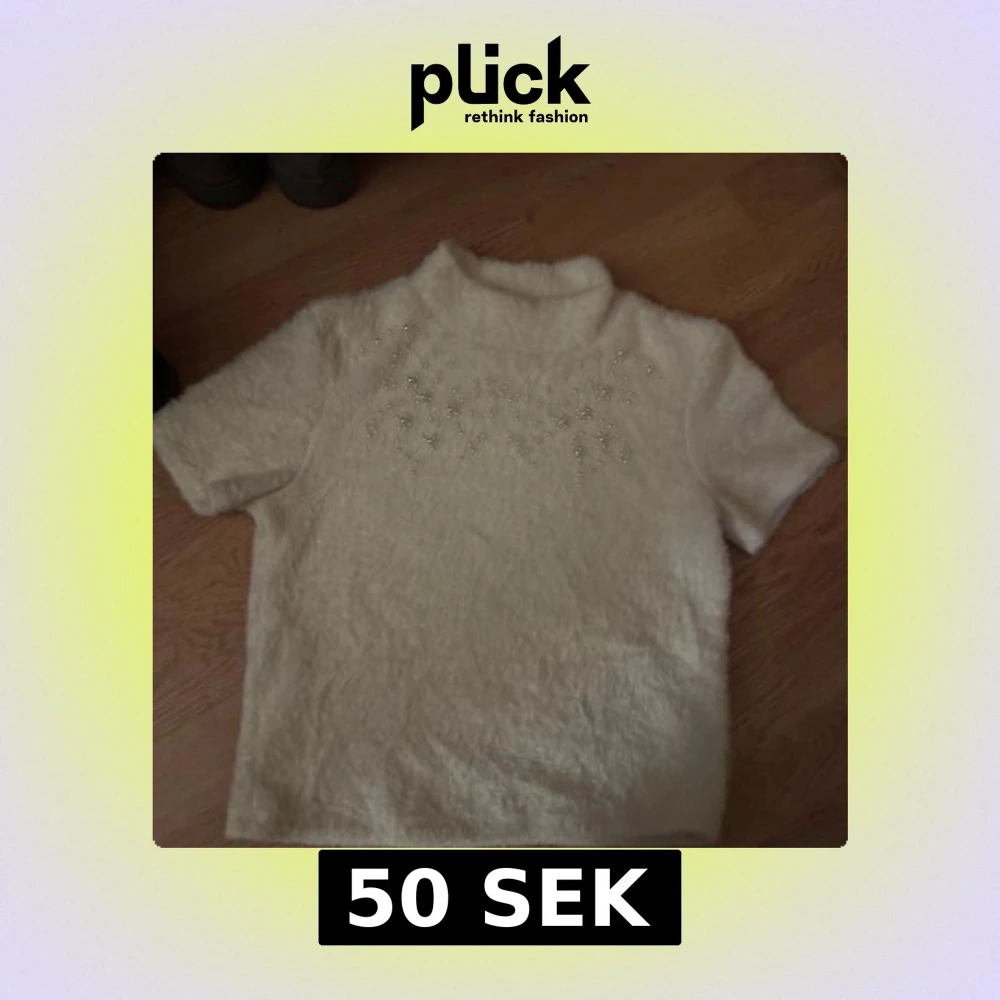 Superfin vit fluffig tröja från Zara med korta ärmar och hög krage. Tröjan har pärldetaljer framtill som ger en extra touch. Materialet är mjukt och känns lyxigt, perfekt för dig som gillar att sticka ut med detaljer.