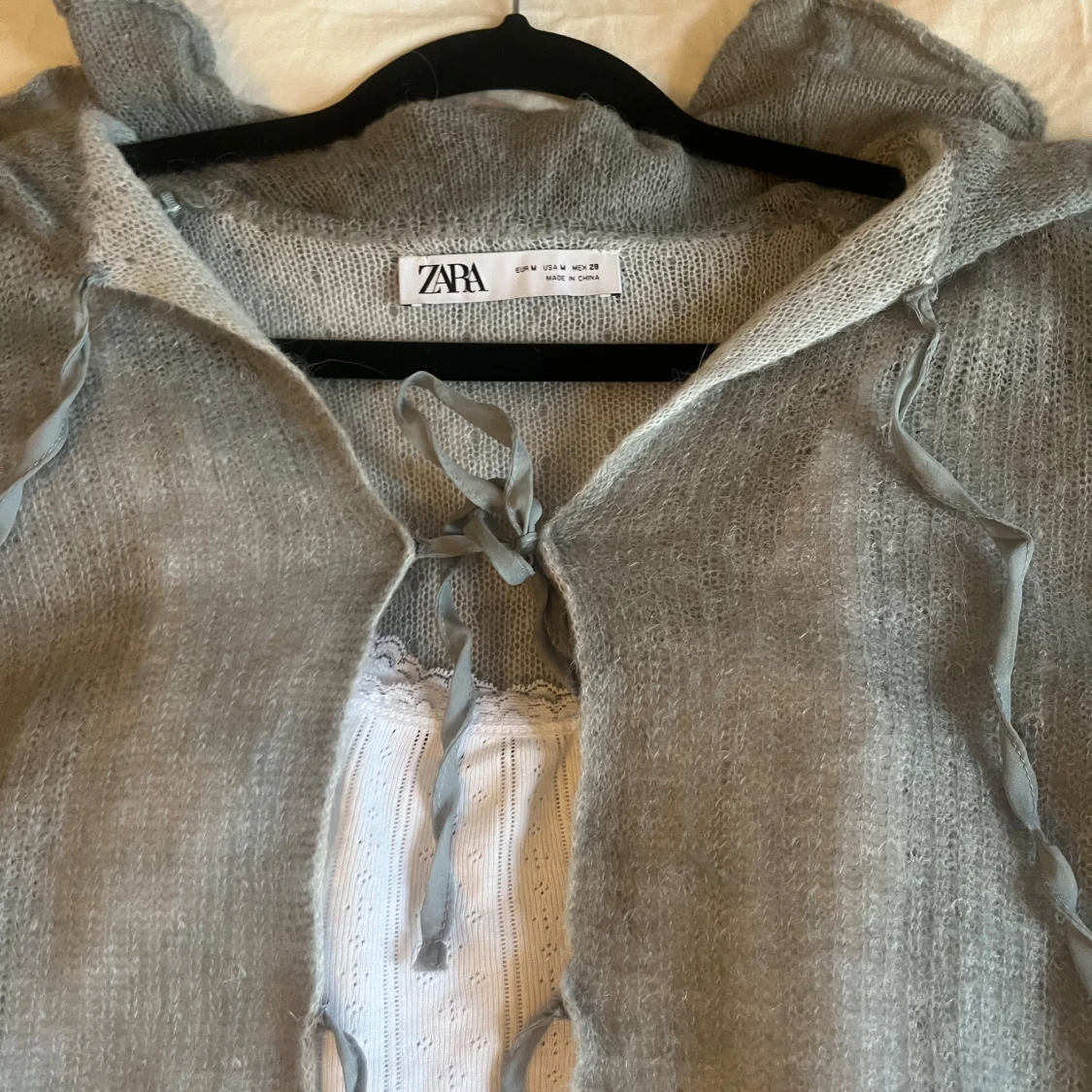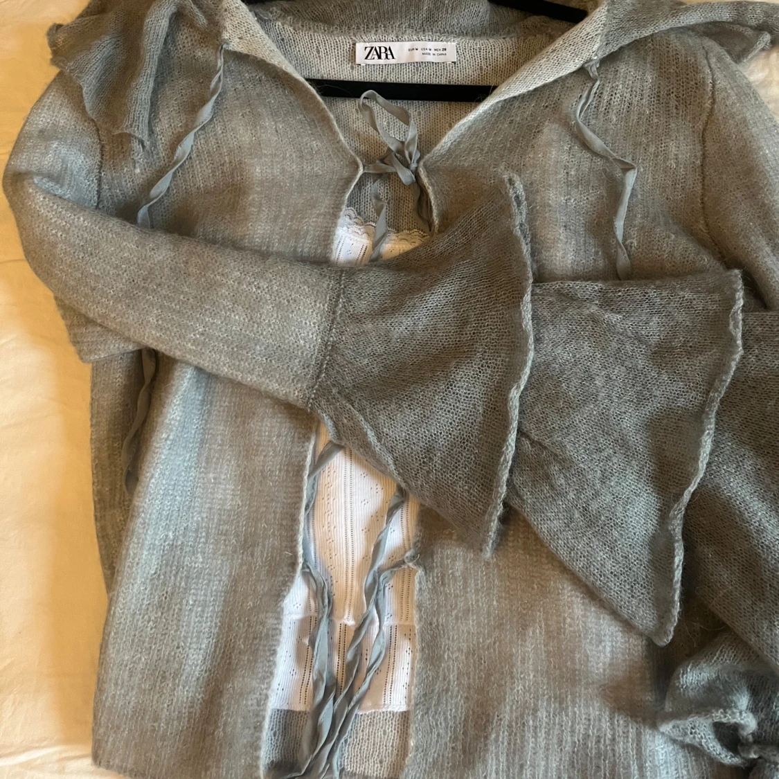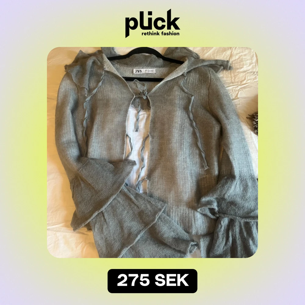Säljer en superfin grå stickad kofta från Zara. Den har volangdetaljer och knytband framtill som ger en söt touch. Perfekt för höst och vår när du vill ha något mysigt men ändå snyggt!! Så söööt, använd en gång!❤️liten i storlek m är perfekt