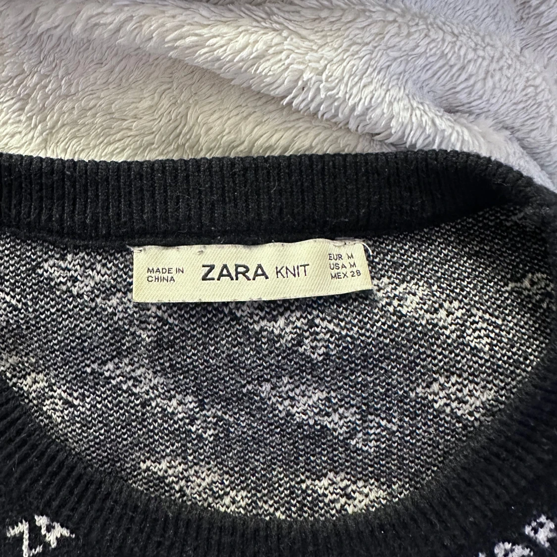 Säljer en svart stickad tröja från Zara med ett vitt mönster över hela. Tröjan har långa ärmar och en rund halsringning. Kommer inte till användning!