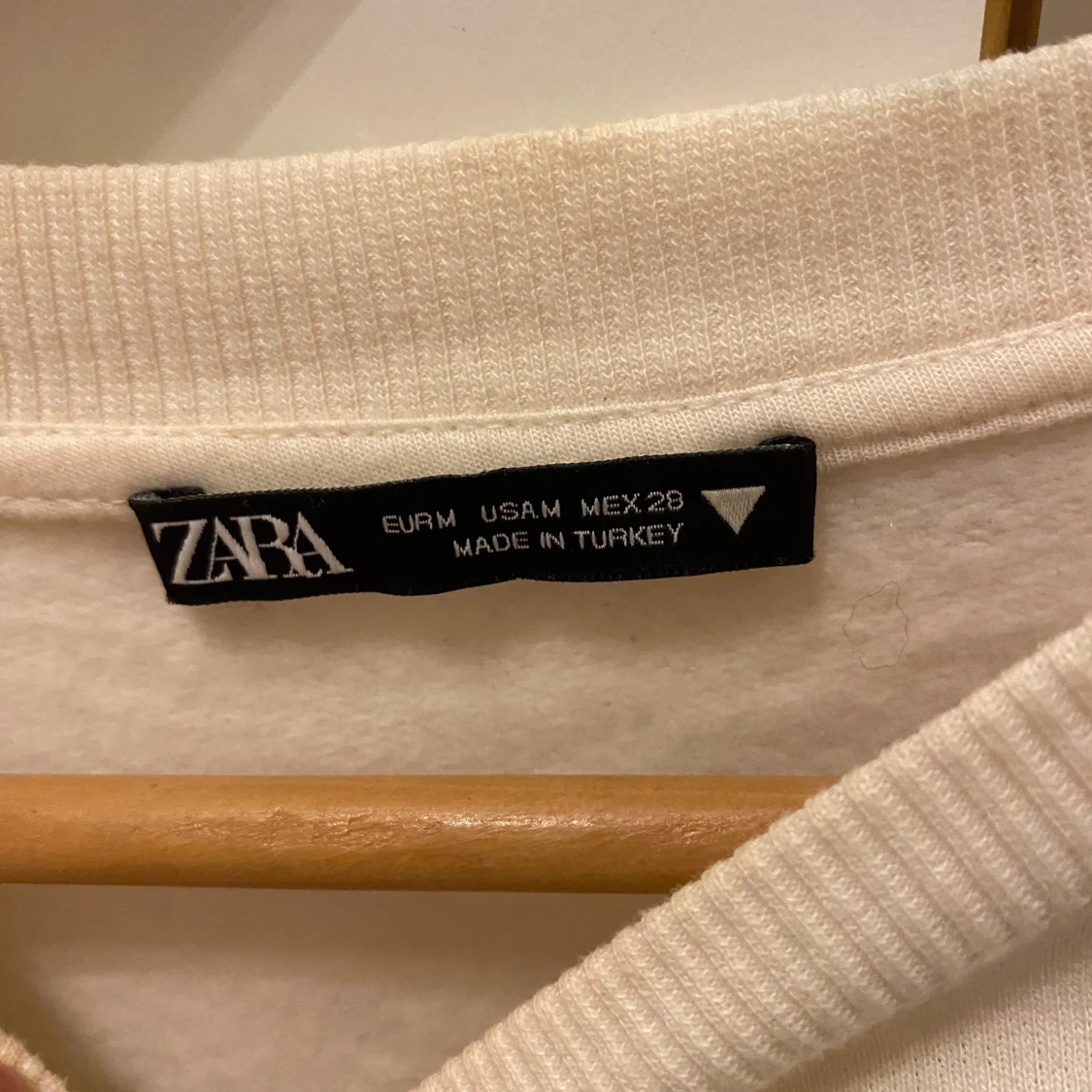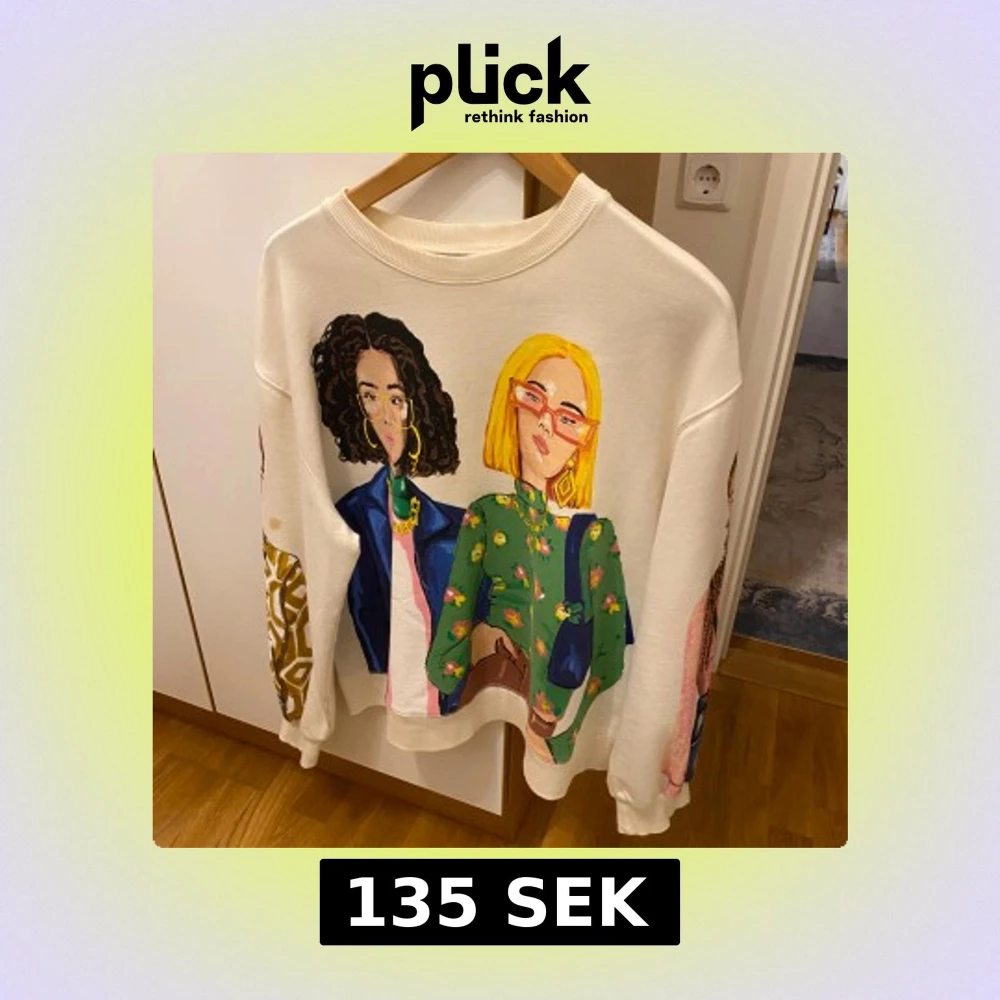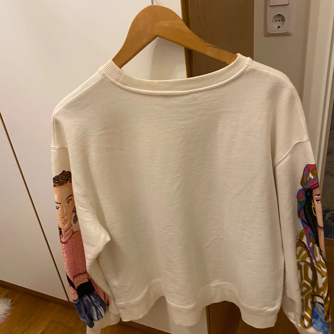 Säljer en cool vit tröja från Zara med färgglatt tryck av olika karaktärer på framsidan och ärmarna. Tröjan har en rund hals och långa ärmar, perfekt för en unik och stilren look.