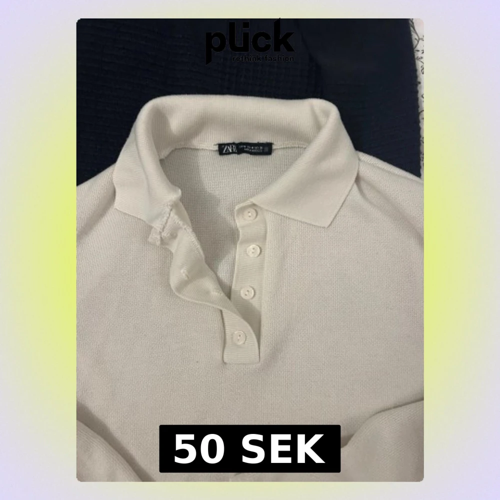 Klassisk vit långärmad skjorta från Zara med krage och knappar framtill. Skjortan är i ett mjukt, stickat material och har en enkel, stilren design som passar till många olika looks. OBS! Tröjan går ner till naveln på mig och jag är 170. Det är en topp basically