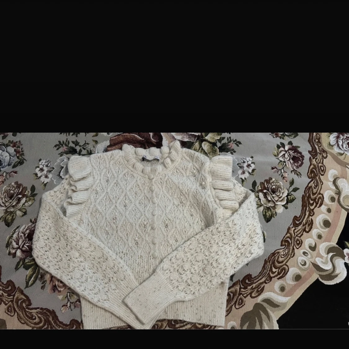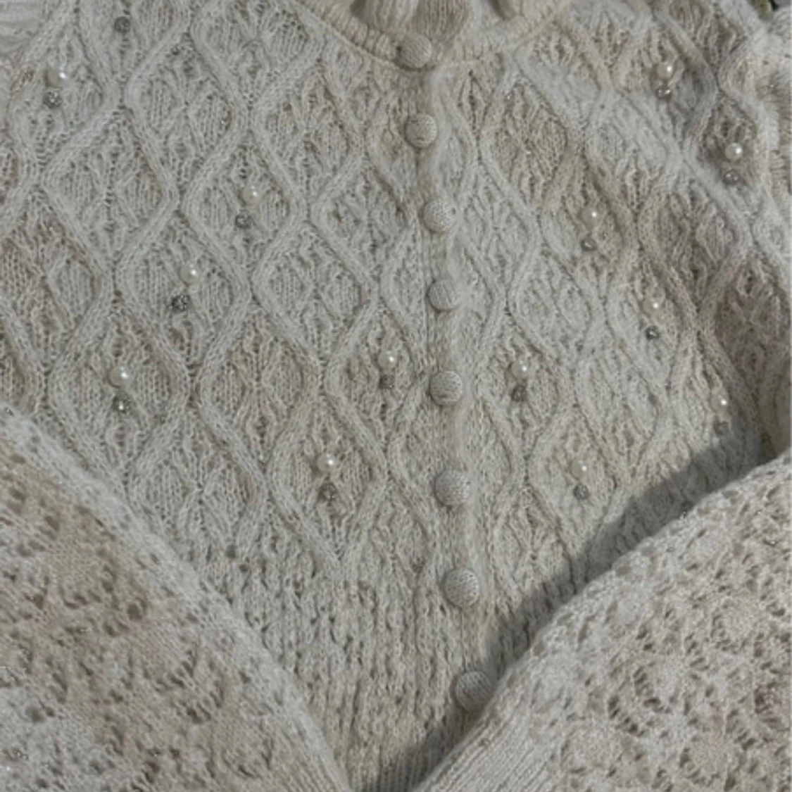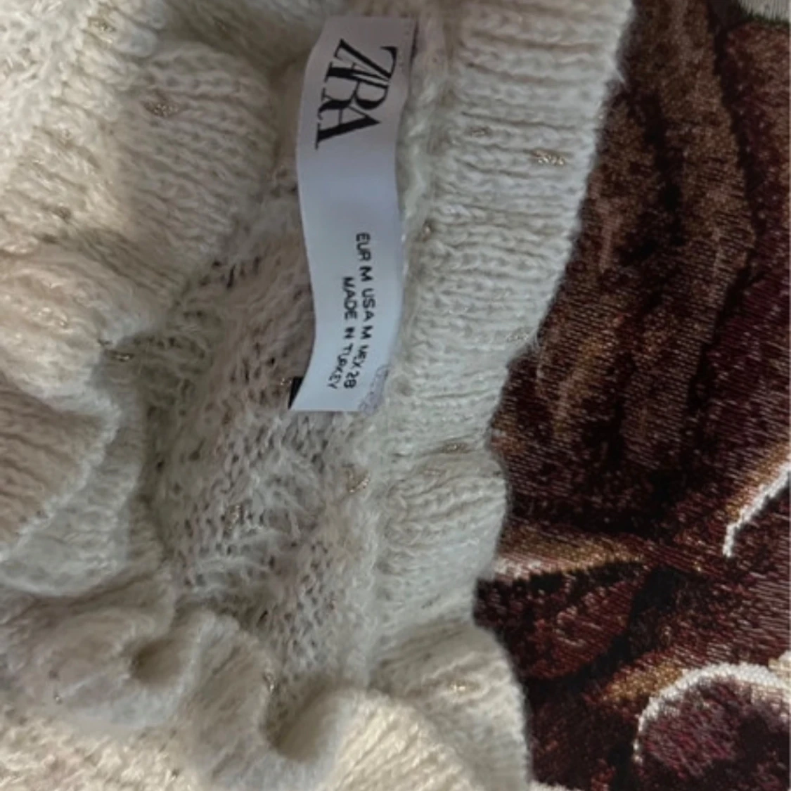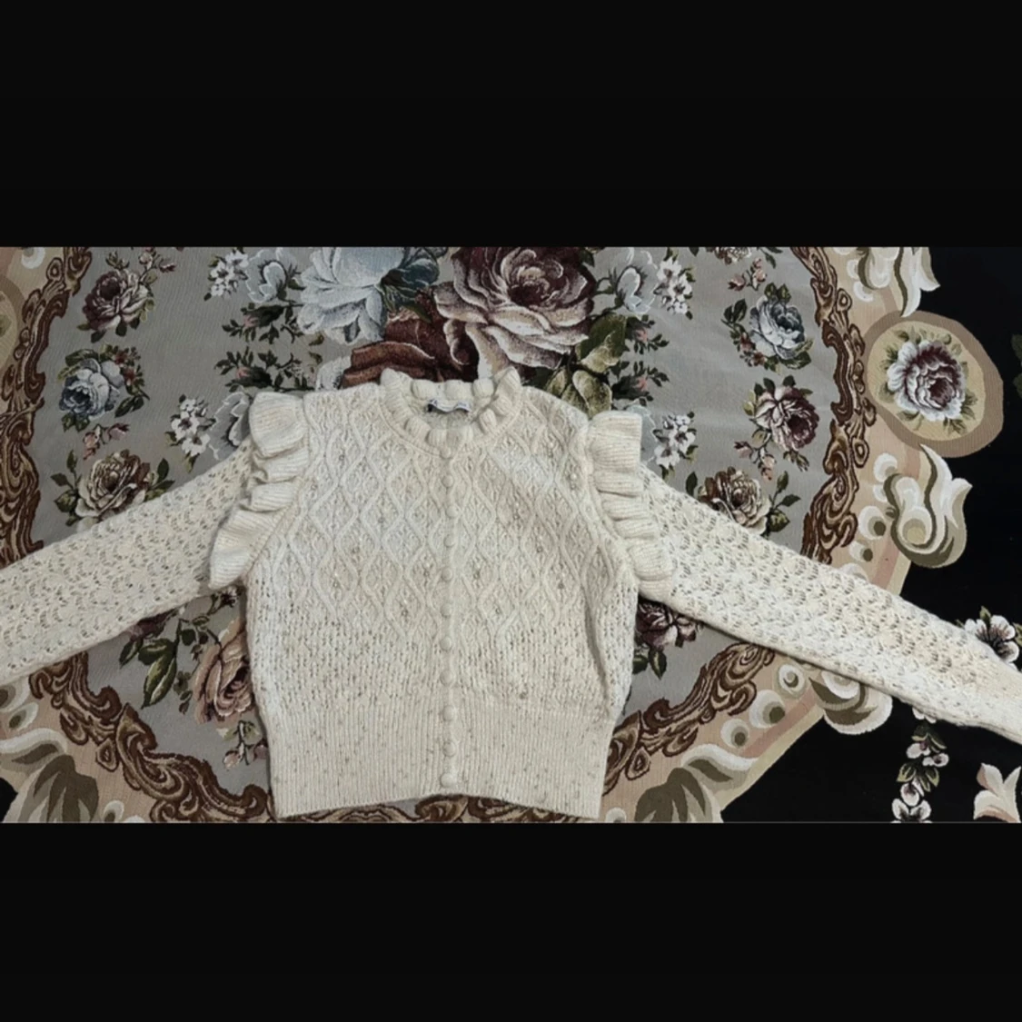 Säljer en söt vit stickad tröja från Zara med volangdetaljer på axlarna och knappar framtill. Tröjan har ett fint mönster och pärlor som ger en extra touch. Perfekt för kyligare dagar. Använd bara fåtal gånger så nyskick