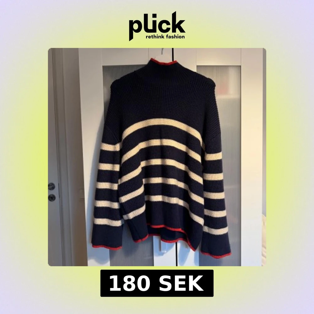 Mysig stickad tröja med breda marinblå och vita ränder samt röda detaljer vid krage, ärmslut och nederkant. Tröjan har polokrage och en oversized passform, perfekt för kyliga dagar. Skriv privat för fler bilder 🩷