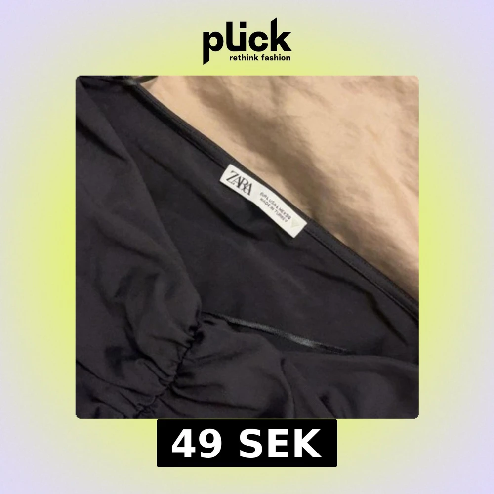 Sätter sig fint på kroppen. Aldrig använt den. Säljer en svart långärmad topp från Zara i storlek M. Toppen har snygg rynkning längs hela framsidan som ger en cool och trendig look. Materialet känns mjukt och stretchigt, perfekt för att styla med jeans eller kjol. Passformen är normal och toppen har en klassisk rund hals.