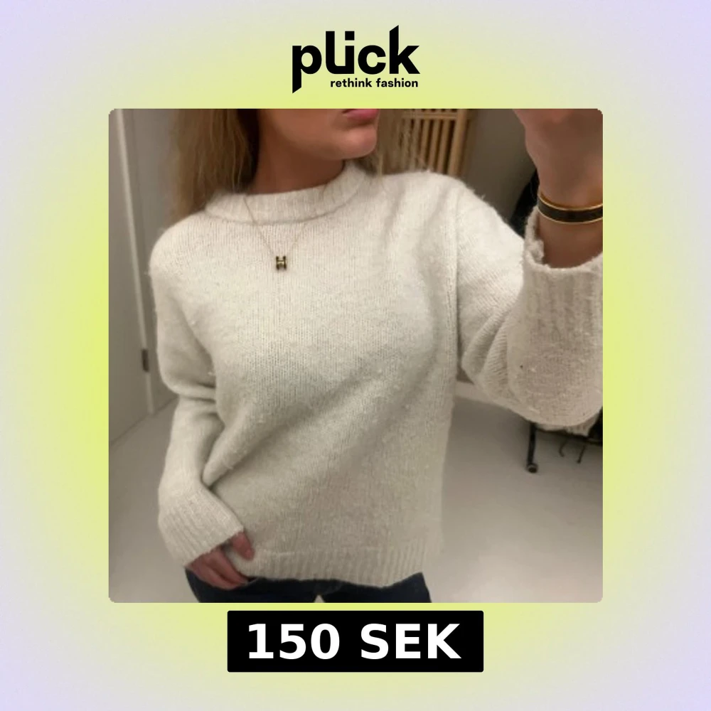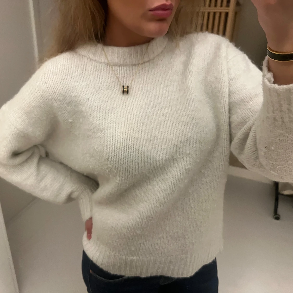 Mysig vit stickad tröja med rund halsringning och ribbade muddar. Tröjan har en relaxed passform och långa ärmar, perfekt för lager på lager. Enkel och stilren design som funkar till jeans eller kjol❤️