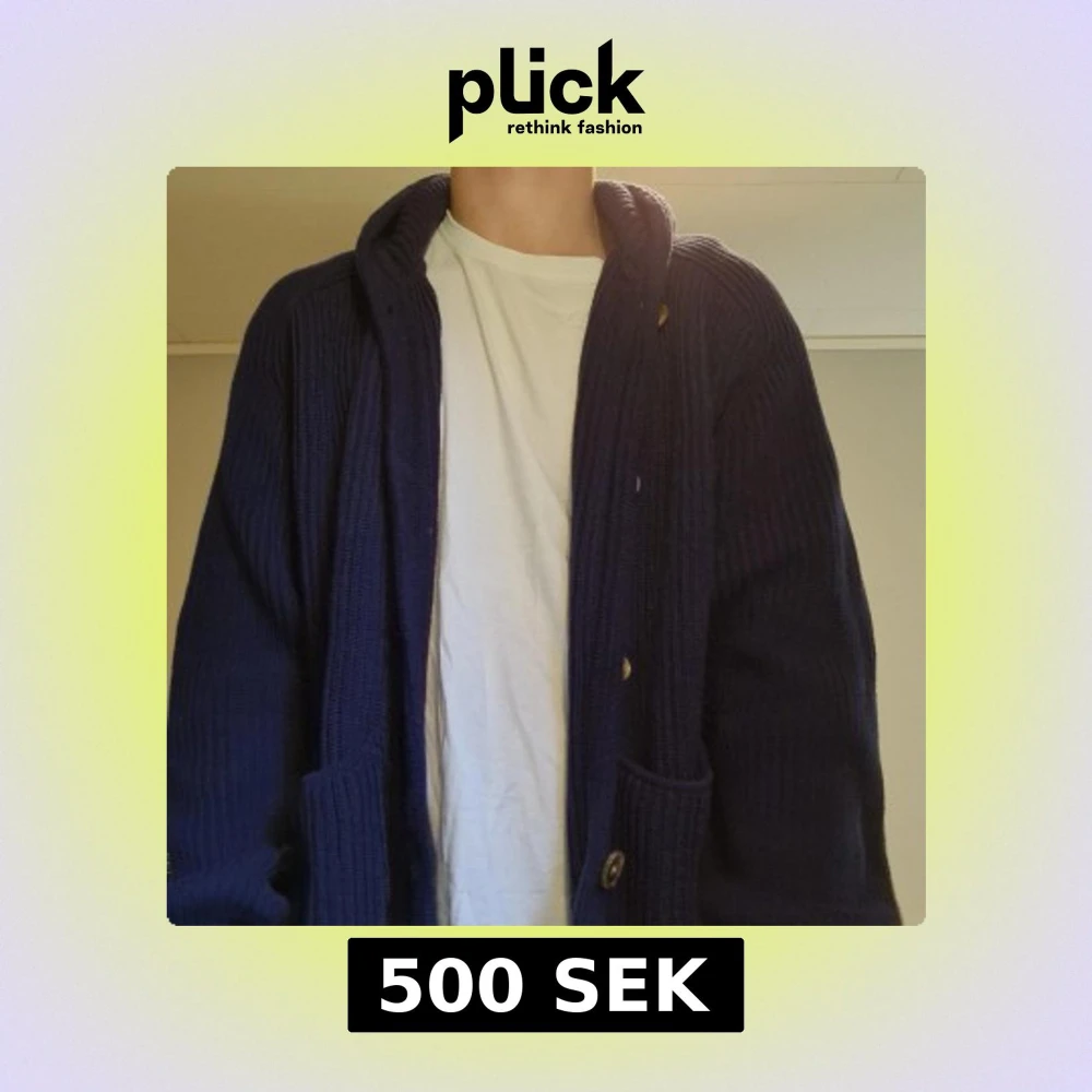 Säljer en mörkblå, grovstickad kofta med huva och stora knappar framtill. Koftan har två rejäla fickor och en avslappnad passform, perfekt för kyliga dagar. Den är långärmad och har en mysig känsla med ribbade muddar.