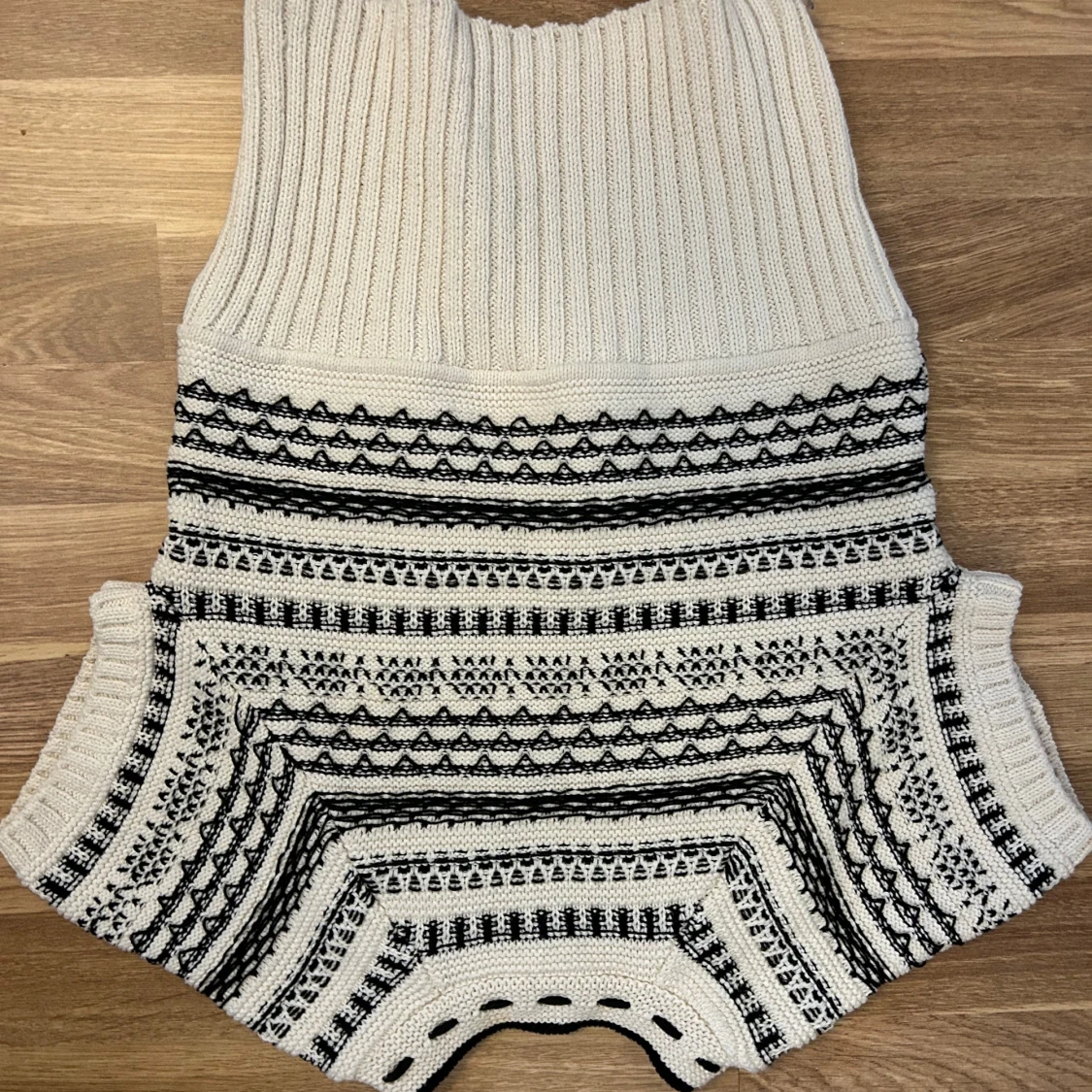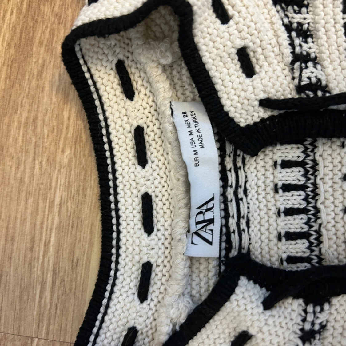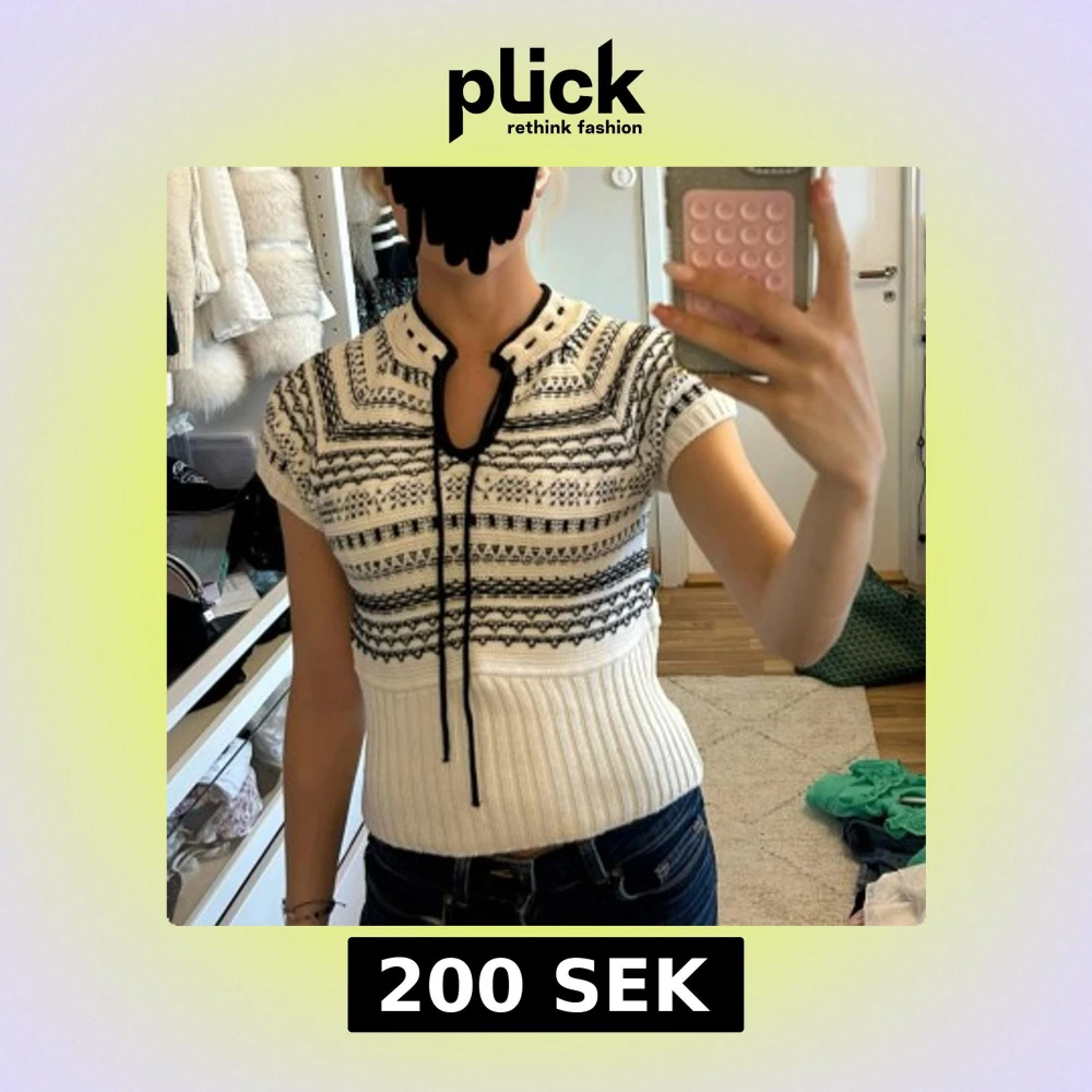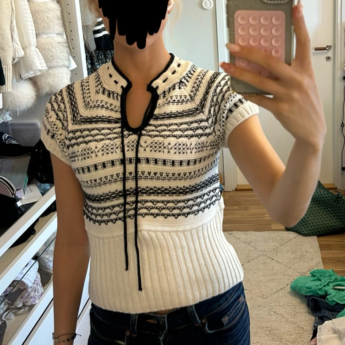 Säljer en snygg stickad topp från Zara i vitt och svart med korta ärmar och coolt grafiskt mönster. Den har snörning vid halsen och ribbad midja som ger en schysst passform. Perfekt för dig som gillar unika detaljer och vill sticka ut lite extra.