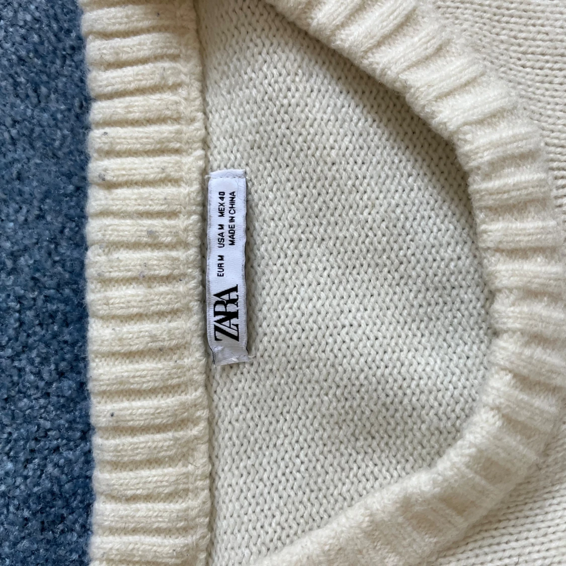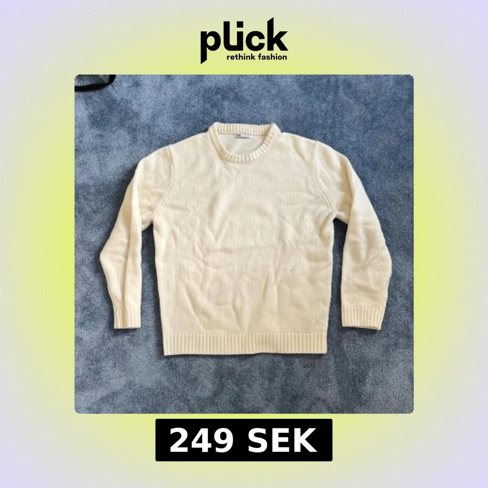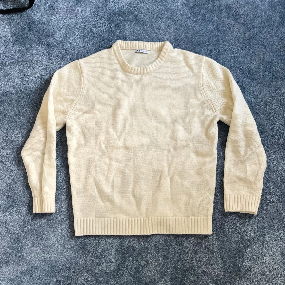 En stilren krämvit stickad tröja från Zara med rund halsringning och ribbade muddar. Perfekt för lager-på-lager och enkel att matcha med jeans eller kjol. Klassisk modell med lång ärm och mjukt material.