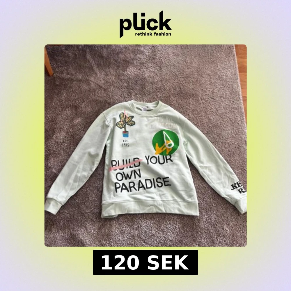 Cool ljusgrön sweatshirt från Zara med tryck framtill i flera färger och texten 'Build Your Own Paradise'. Rund halsringning och långa ärmar. Perfekt för en avslappnad stil.
