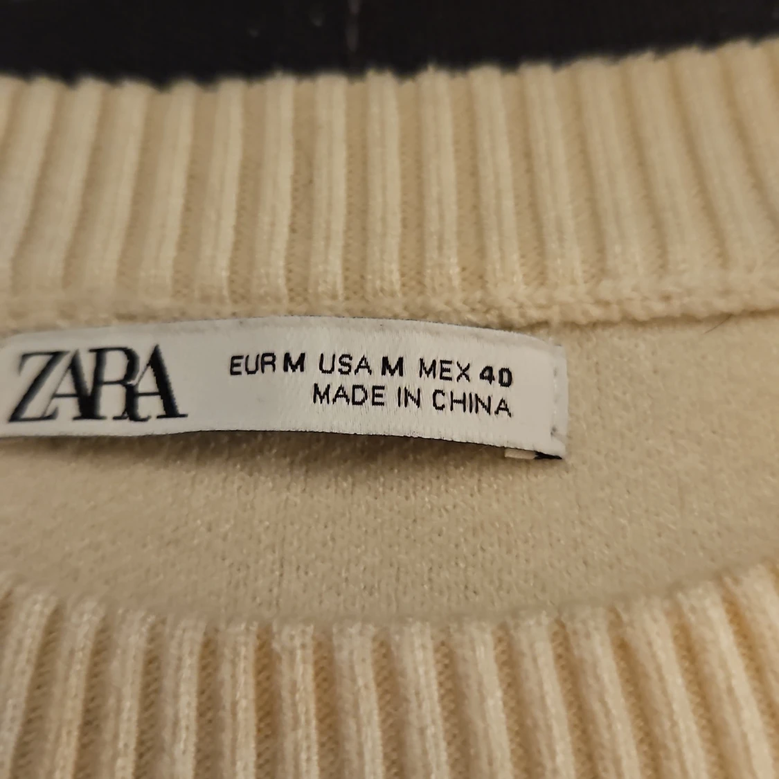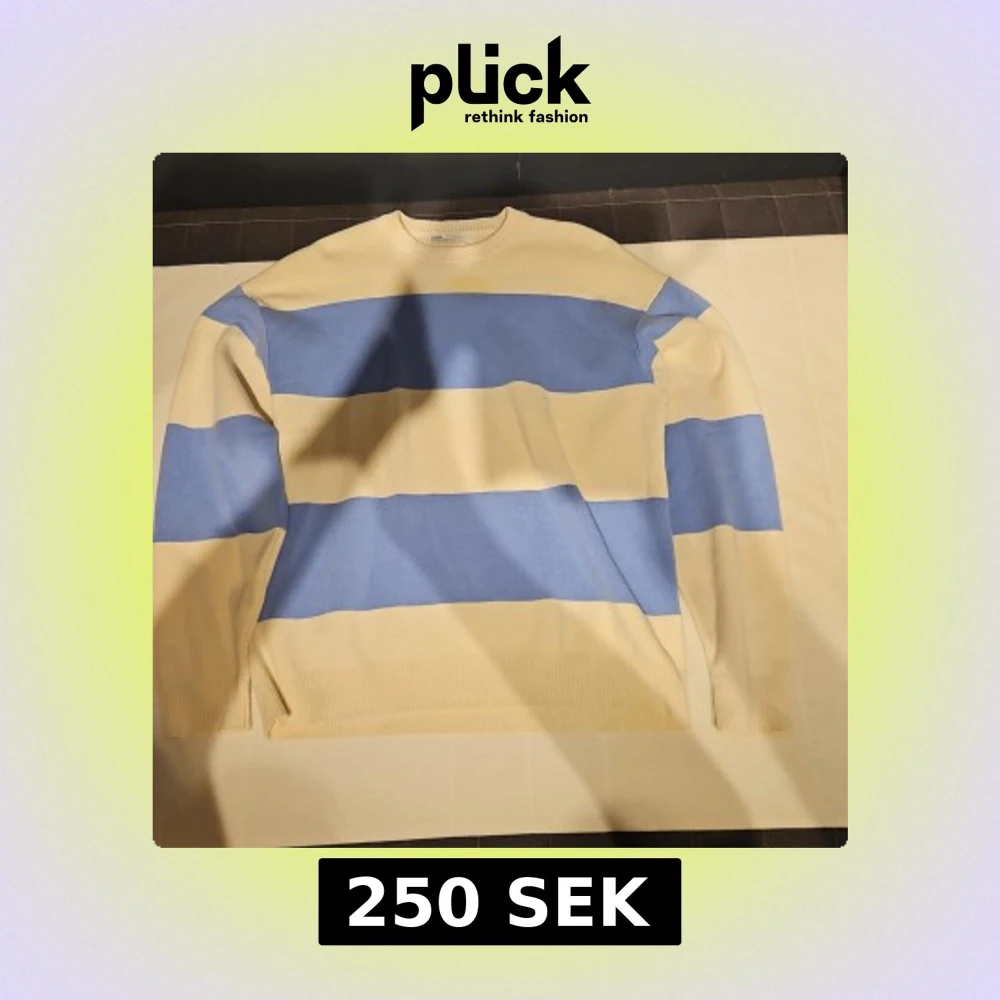 Säljer en snygg randig tröja från Zara i storlek M. Tröjan har breda blå och beige ränder, rund halsringning och långa ärmar. Perfekt för dig som gillar en stilren men ändå lekfull look. Perfekt för dig som vill vara fint klädd och varm på samma gång.