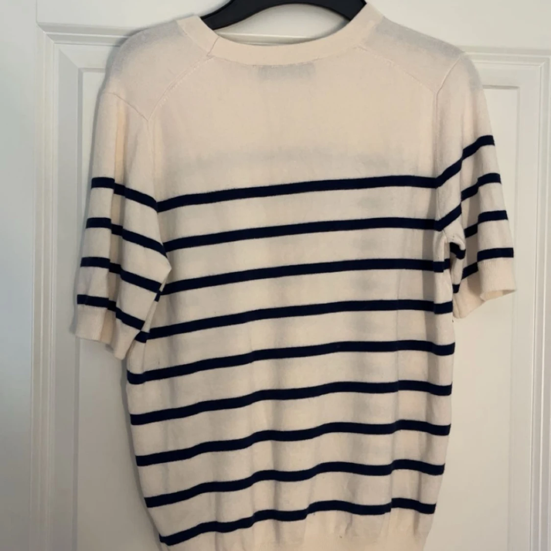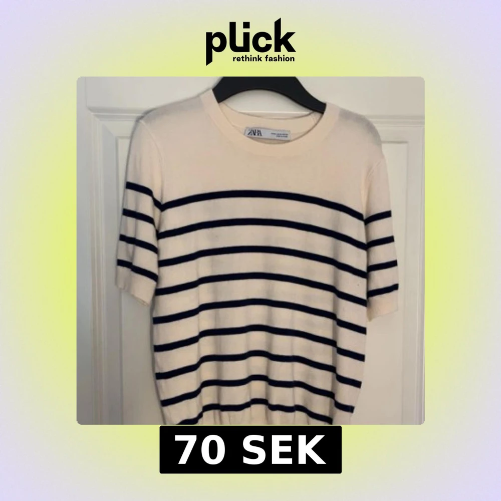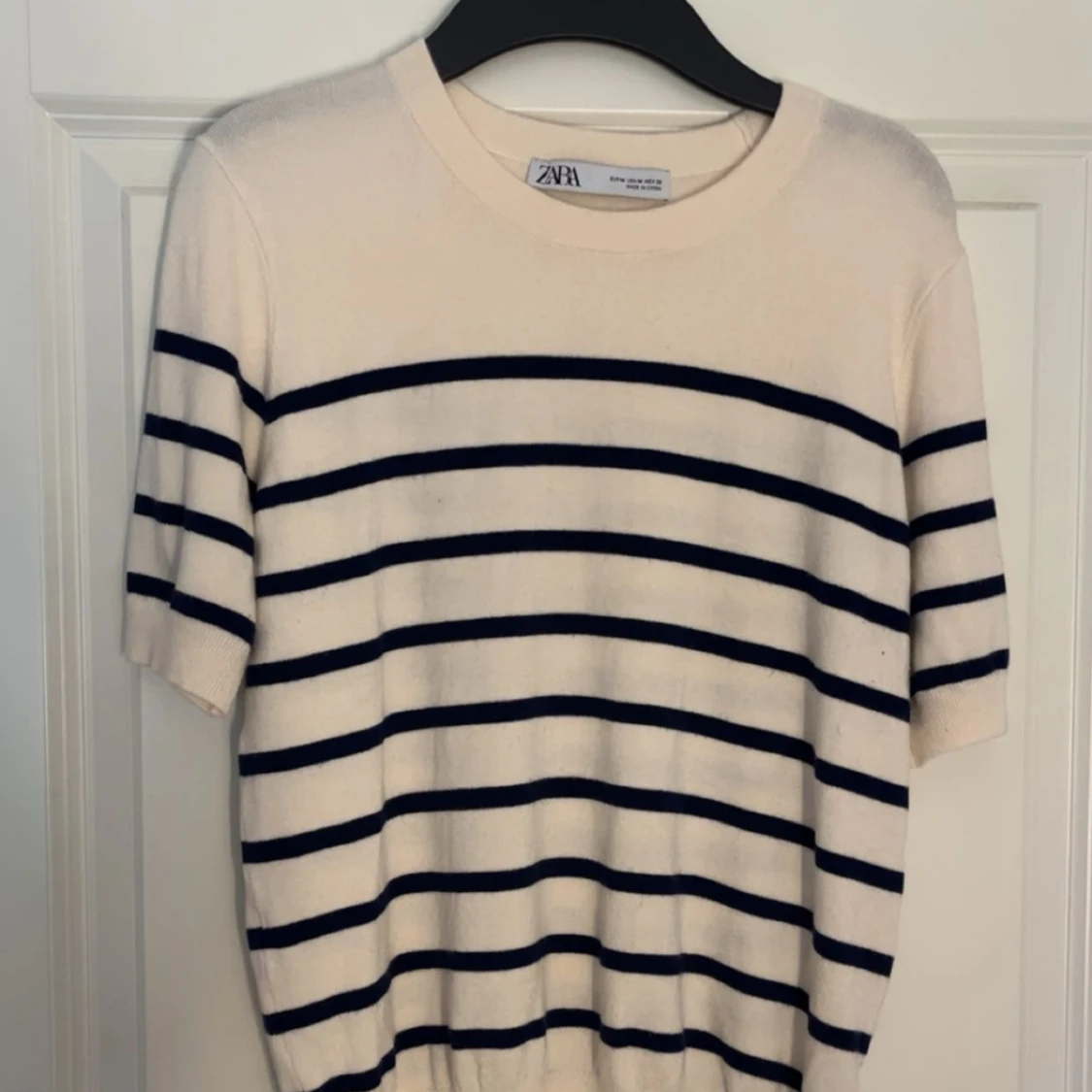 Säljer en vit tröja med marinblå ränder från Zara. Tröjan har korta ärmar och rund halsringning. Materialet känns mjukt och lätt, perfekt för vår och sommar!💞Den är liten i storlek. Storleken är M men känns som S/XS ( använd 1 gång )