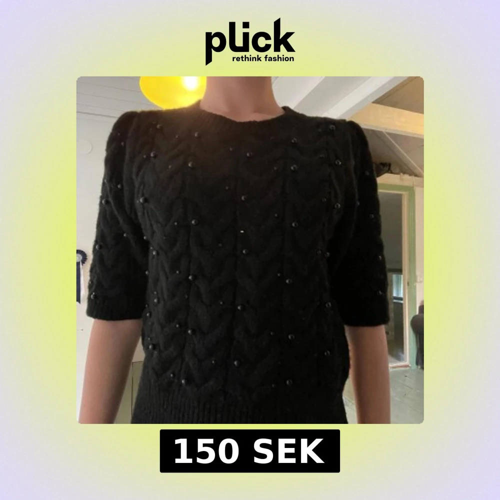 Säljer en svart stickad tröja från Zara med snyggt kabelstickat mönster och svarta pärlor över hela tröjan. Tröjan har halvlånga ärmar och ribbade muddar. Den passra bra till alla årstider och är varm och snygg. Den har olika storlek på pärlor.