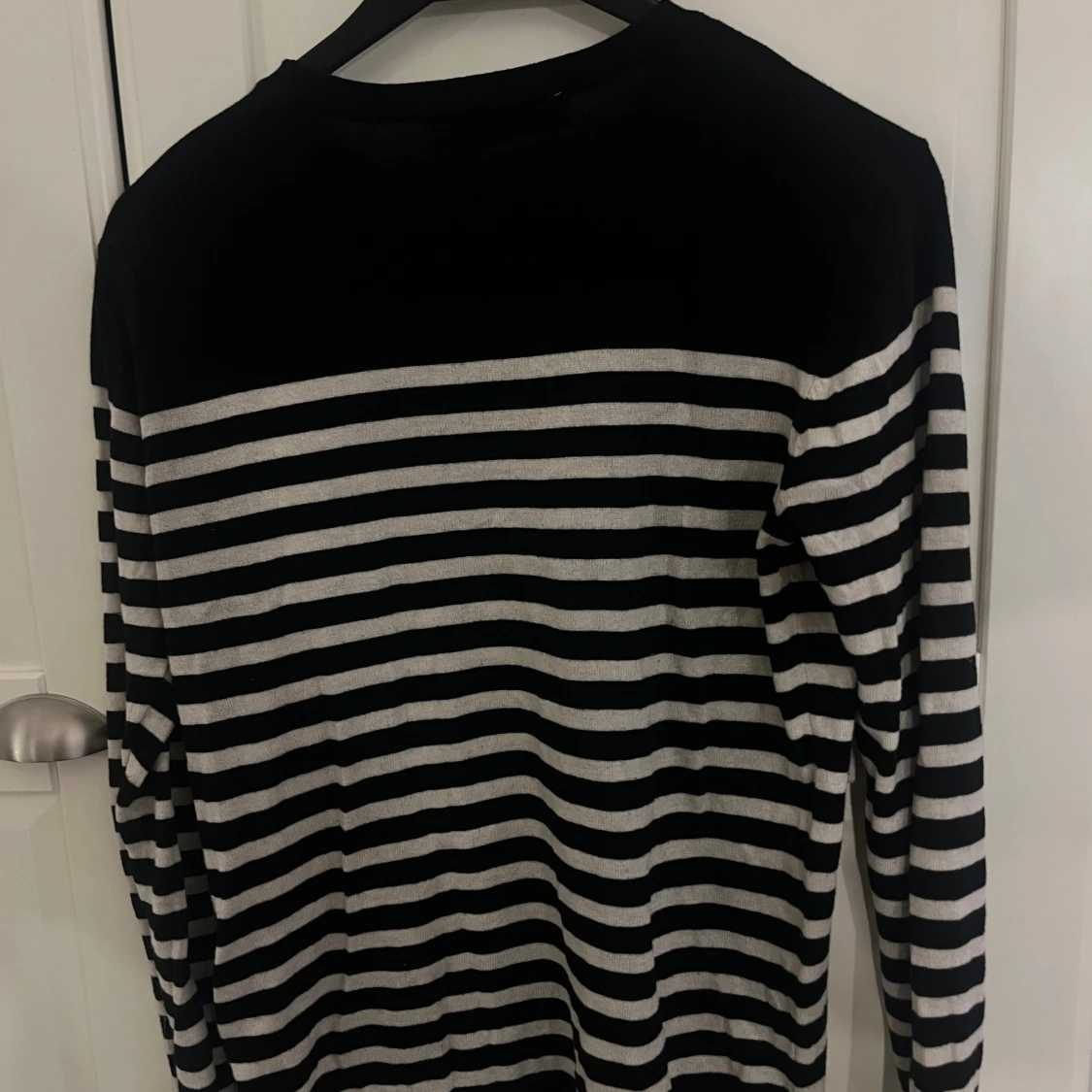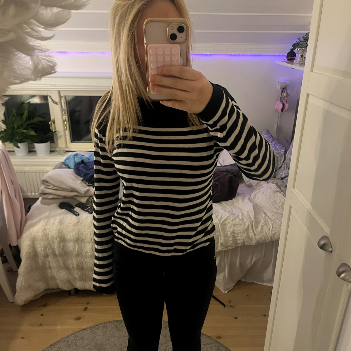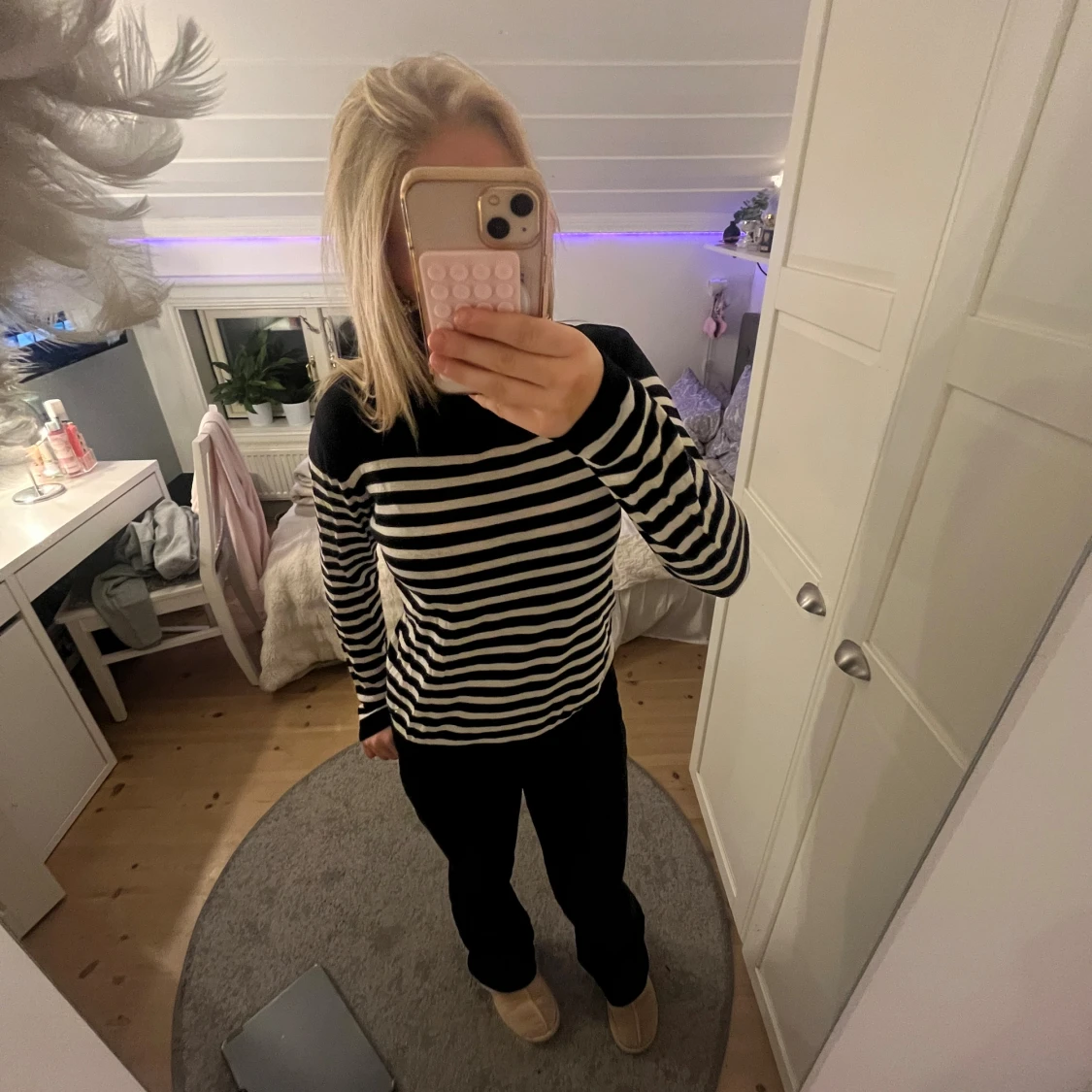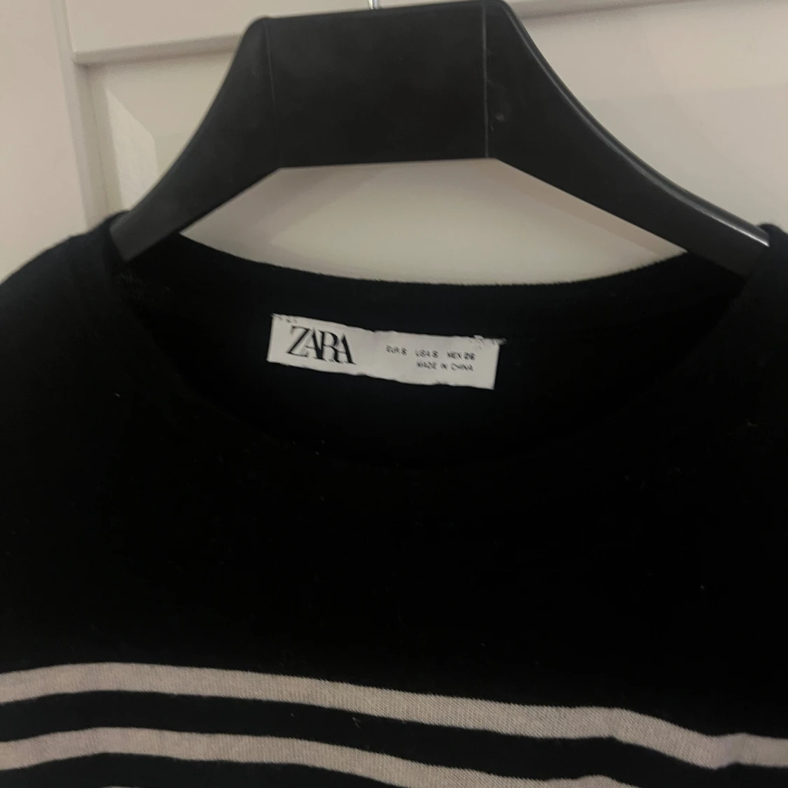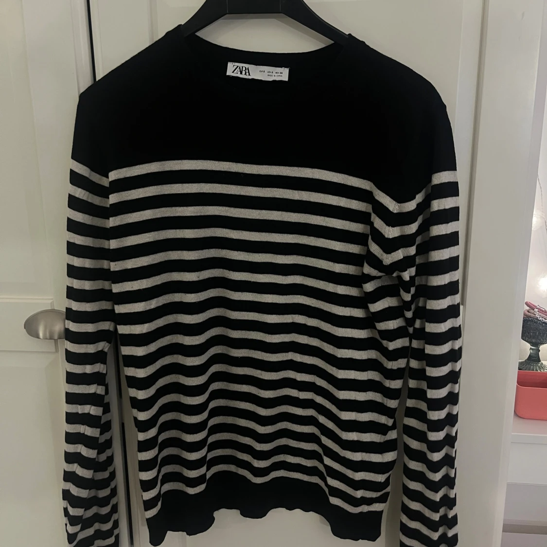 Säljer en svart och vit randig långärmad tröja från Zara. Tröjan har klassisk rund halsringning och är i ett mjukt, stickat material. Passformen är normal och tröjan är superenkel att matcha. Jag tycker den är jättefin men tyvärr för liten för mig💞