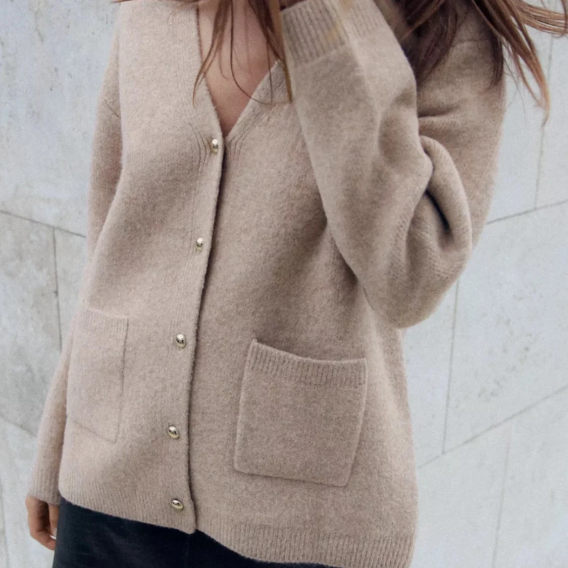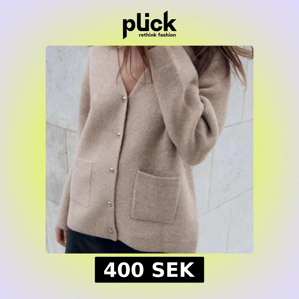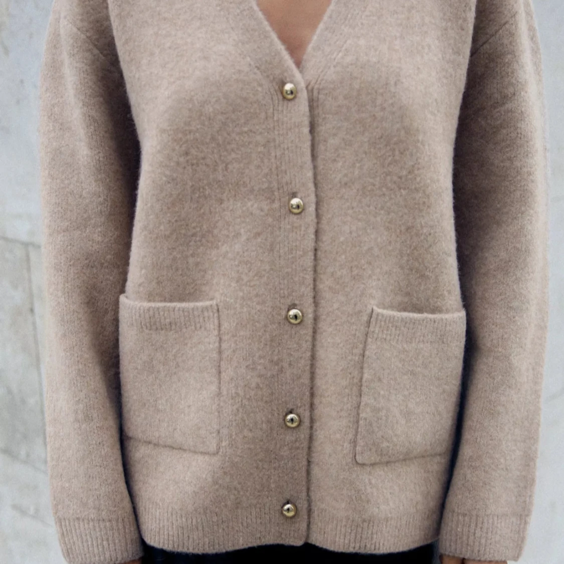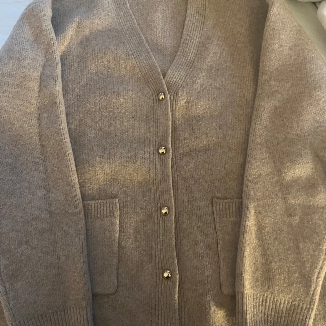 Supermjuk beige kofta med snygga guldknappar framtill och två stora fickor. Koftan har v-ringning, lång ärm och en loose fit som ger en chill vibe. Perfekt att slänga över en t-shirt eller ha som lager på lager under kyliga dagar. Jättesnygg och känns som en i mängden!! Tveka inte över att höra av dig vid frågor:)