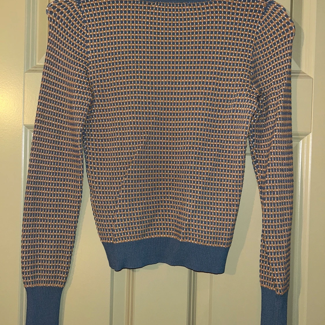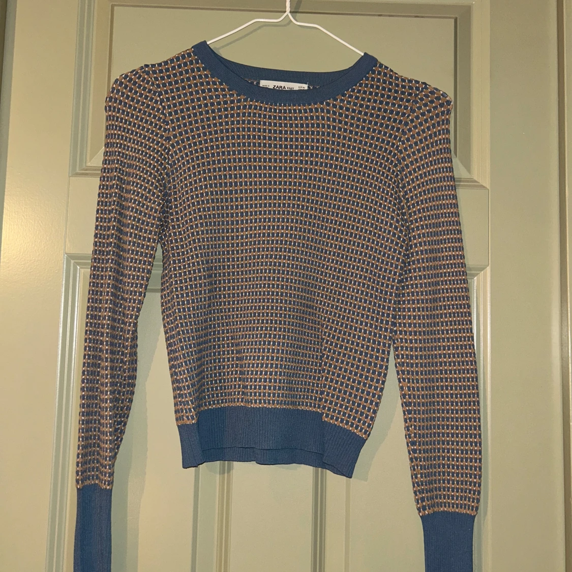 Säljer en snygg stickad tröja från Zara med ett unikt mönster i blått och brunt. Tröjan har långa ärmar och ribbade kanter vid ärmslut och nederkant. Perfekt för att ge din outfit en cool touch!