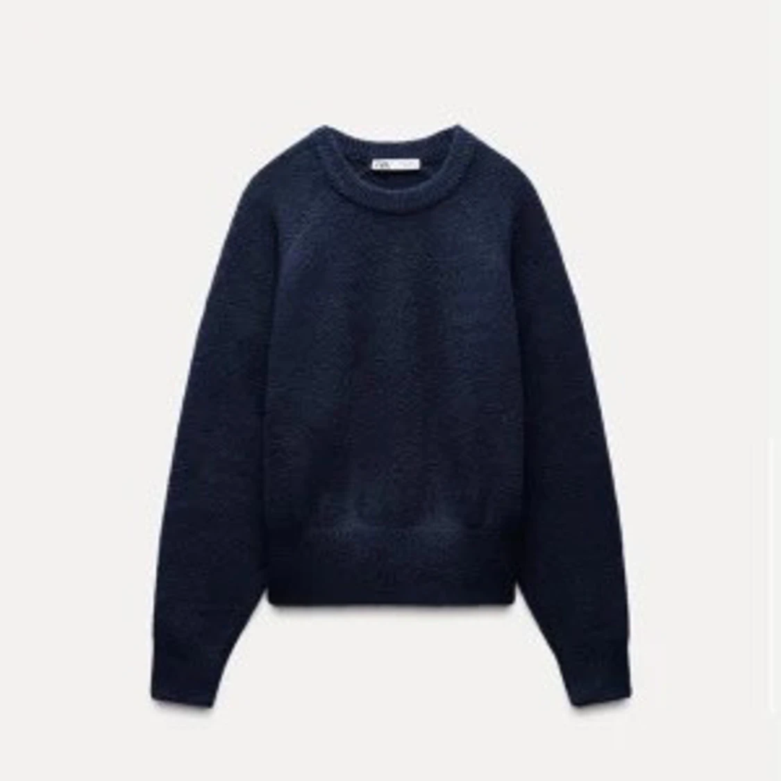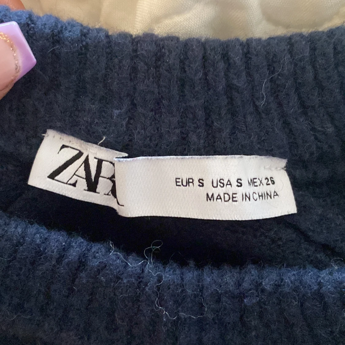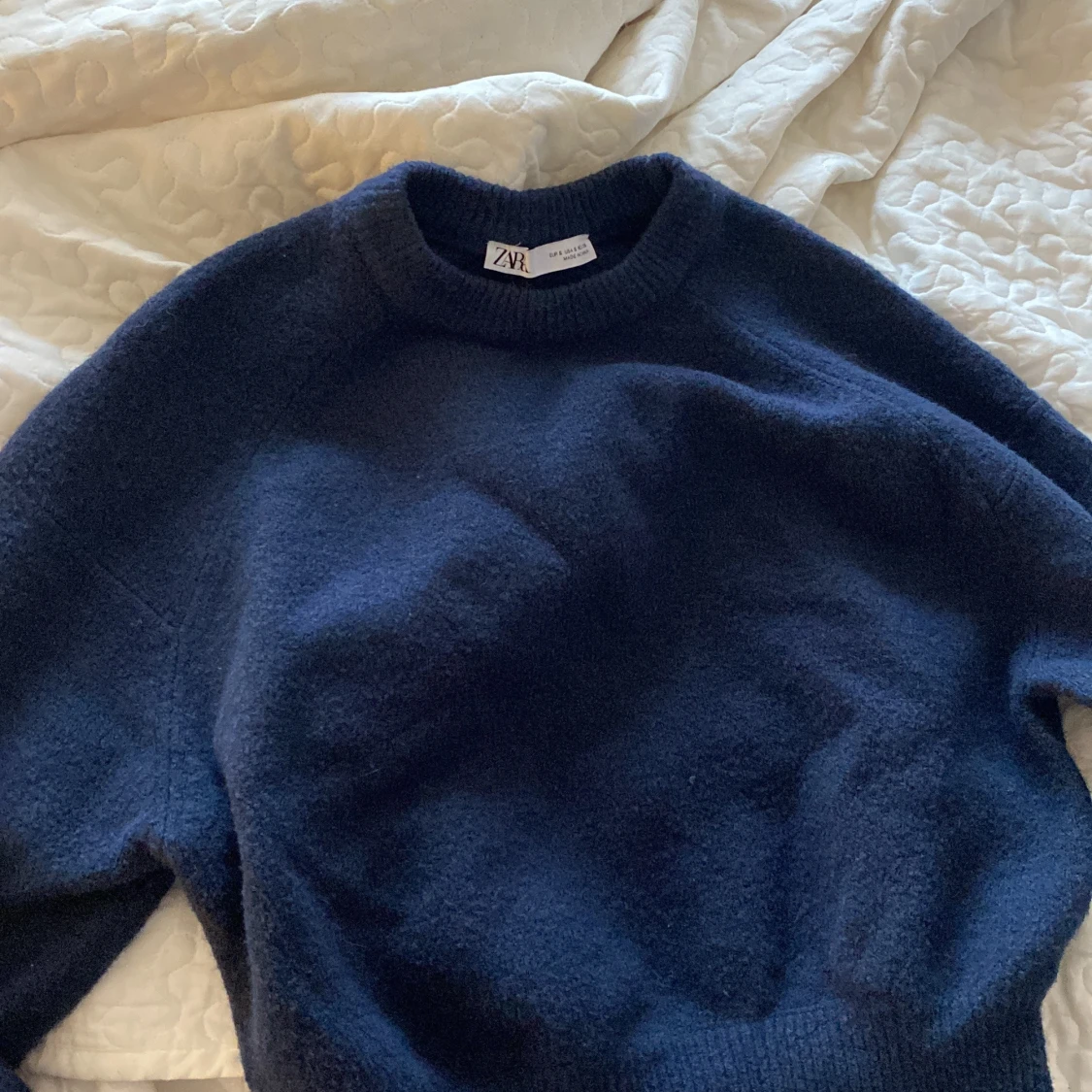 Mysig mörkblå stickad tröja från Zara i storlek S. Tröjan har rund halsringning, långa ärmar och en klassisk, enkel design som är lätt att matcha. Perfekt för kyliga dagar och passar till både jeans och kjol. Jättebra skick skulle inte säga att den är nopprig