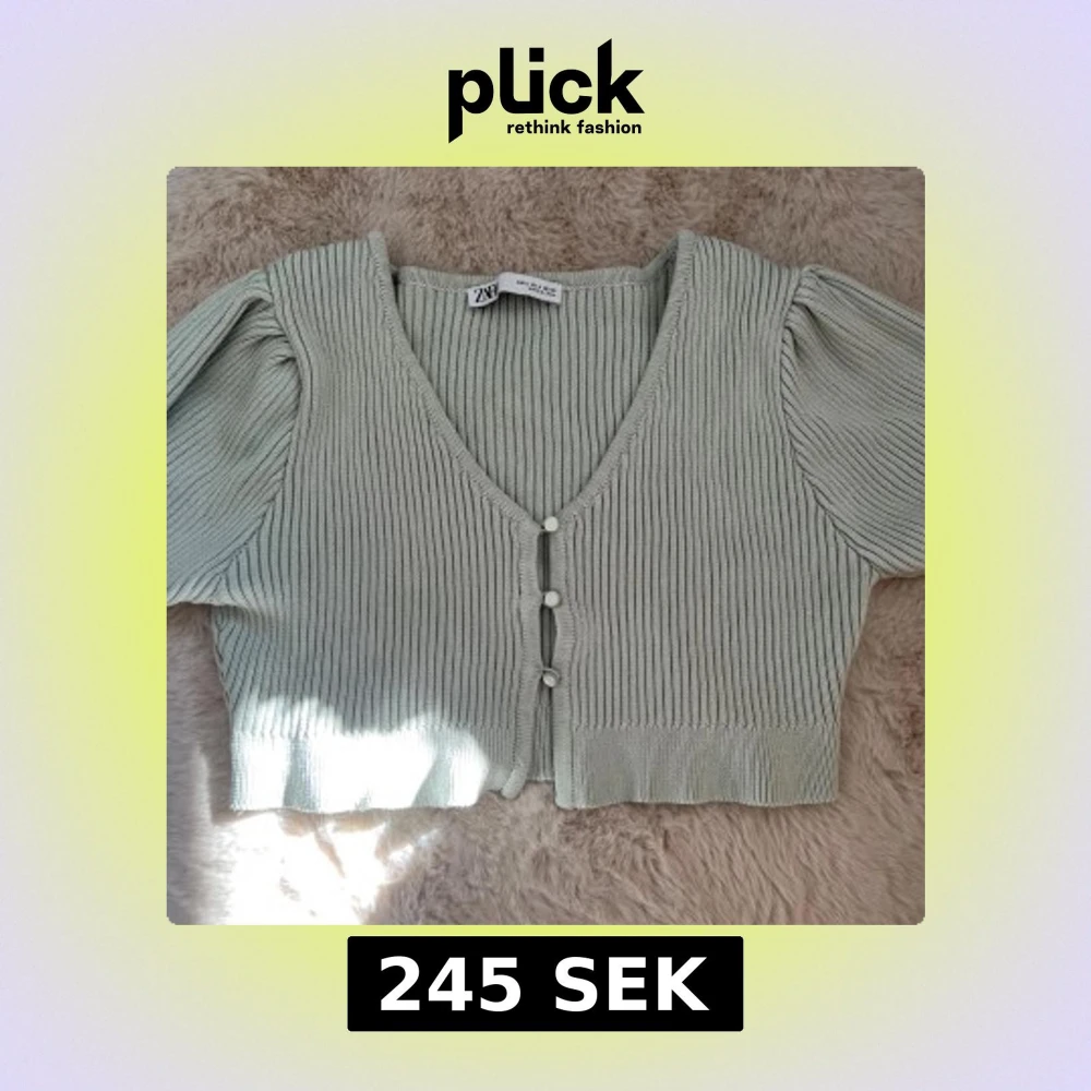 Superfin ljusgrön ribbad bolero från Zara med korta puffärmar och v-ringning. Den är croppad och har snygga knappar framtill. Perfekt att styla med höga jeans eller kjol för en trendig look. 💘Använd 1 gång och köpt på Vinted🫰🏼
