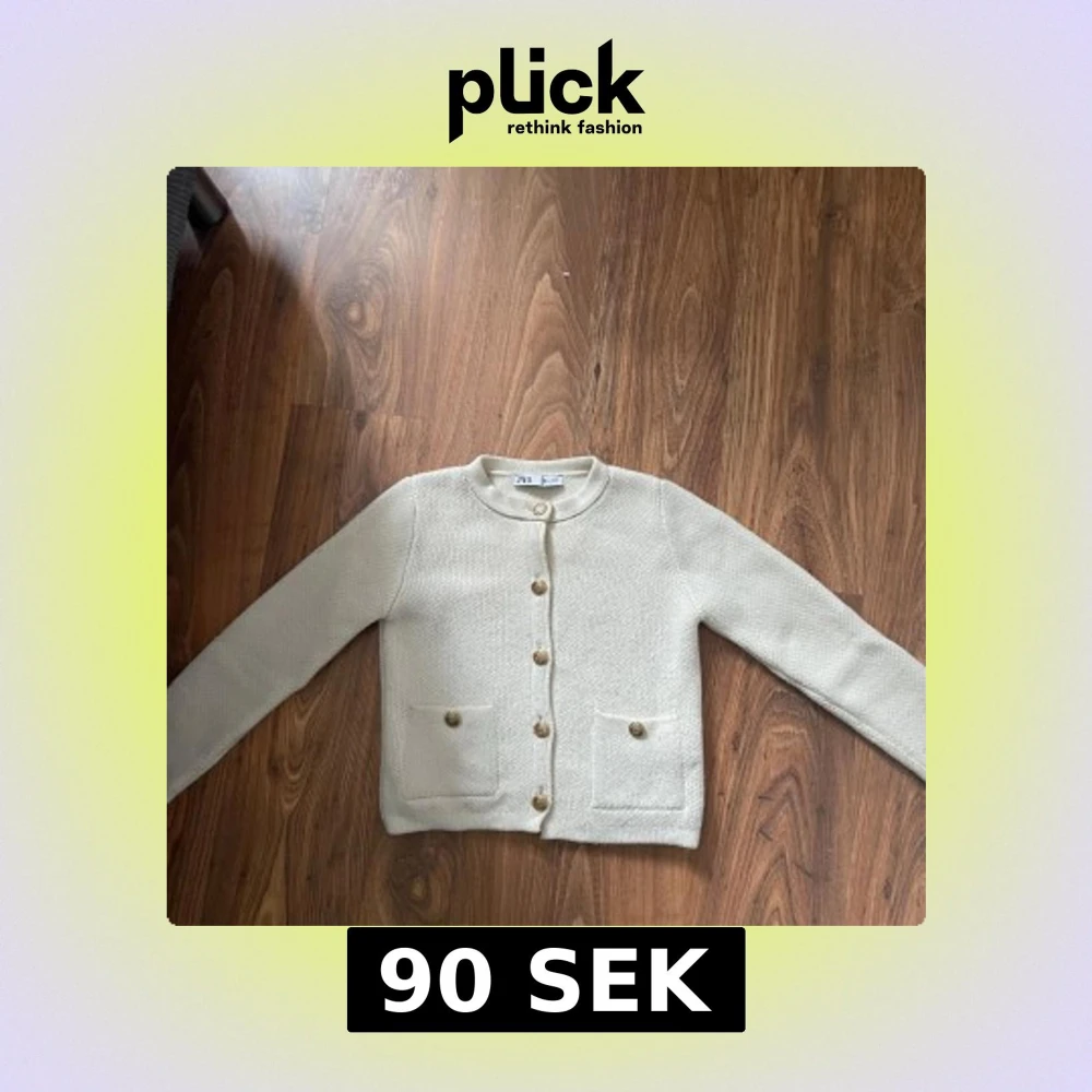Snygg beige kofta från Zara i stickat material. Den har rund halsringning, två fickor framtill och dekorativa guldiga knappar hela vägen. Perfekt för lager-på-lager och ger en clean och stilren vibe.