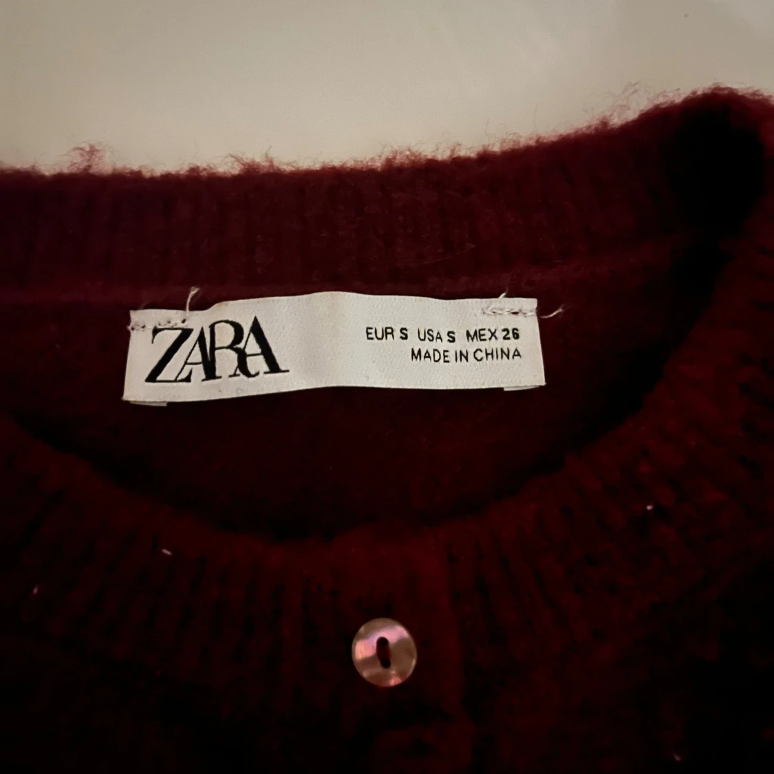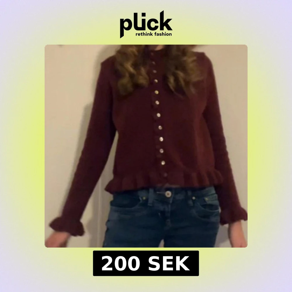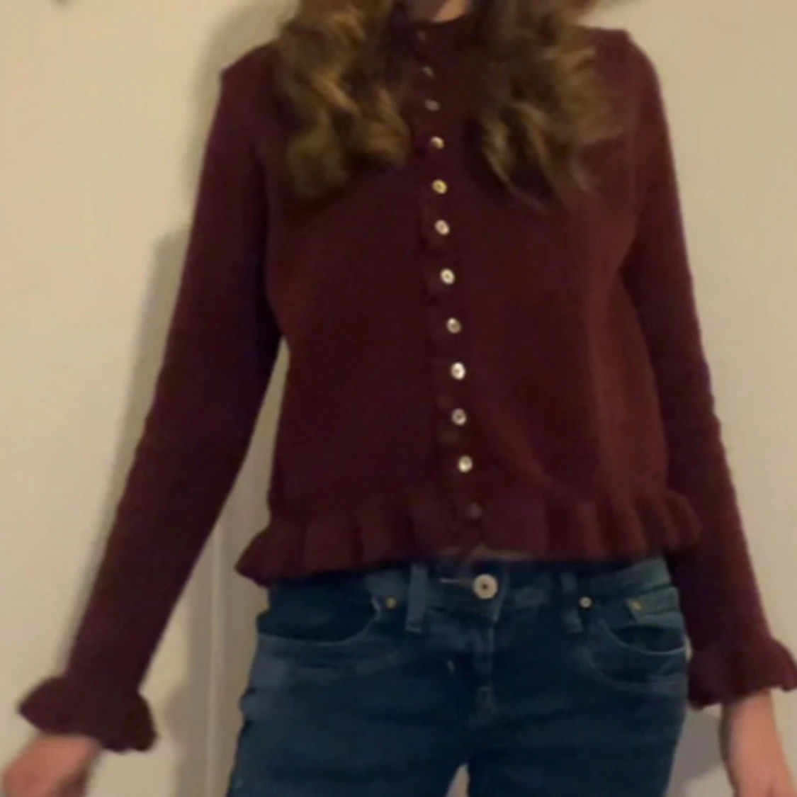 Supersöt vinröd kofta från Zara med volangdetaljer vid ärmslut och nederkant. Tröjan har rund hals, knappar hela vägen framtill och är stickad i ett mjukt material. Den är i mycket bra skick och i storlek S.