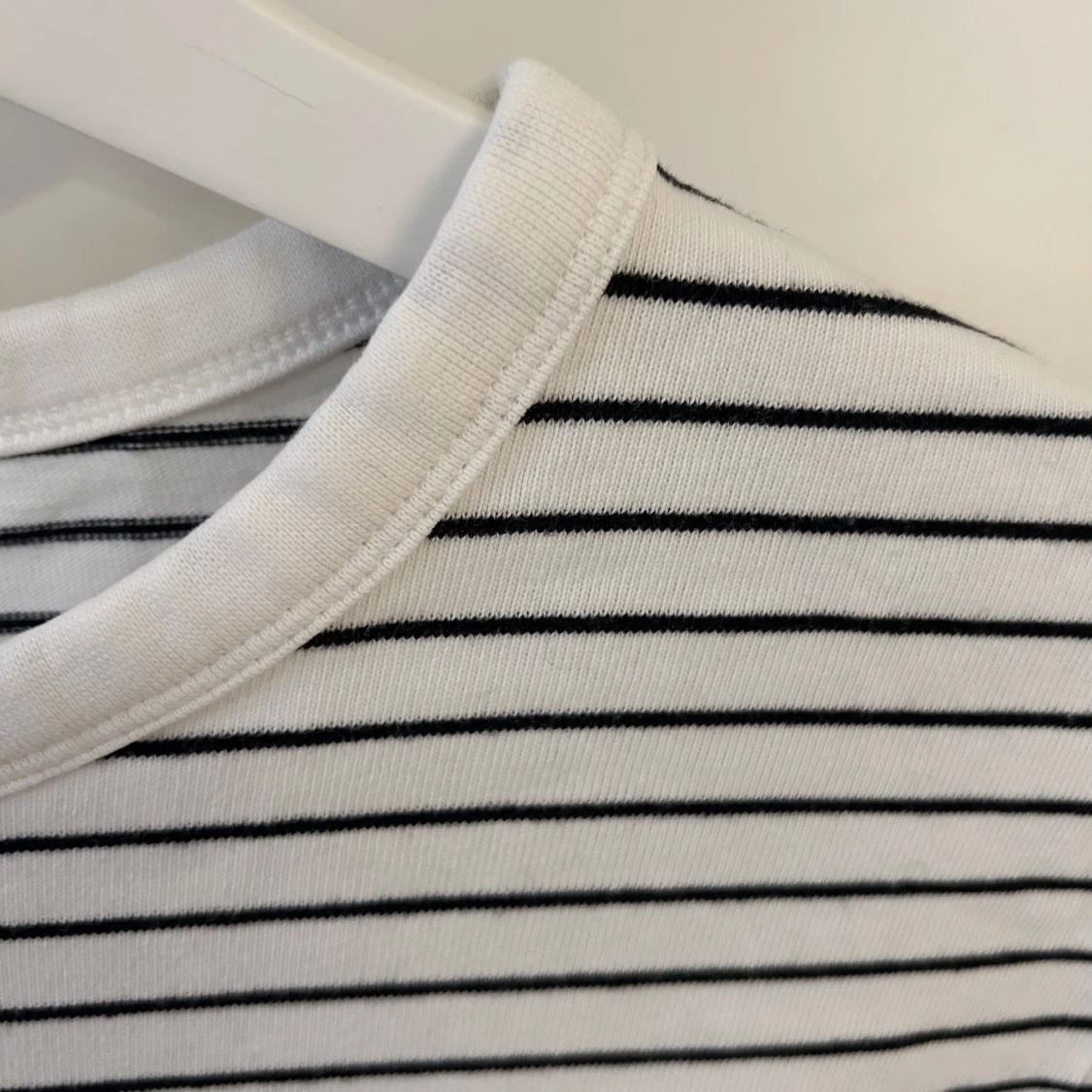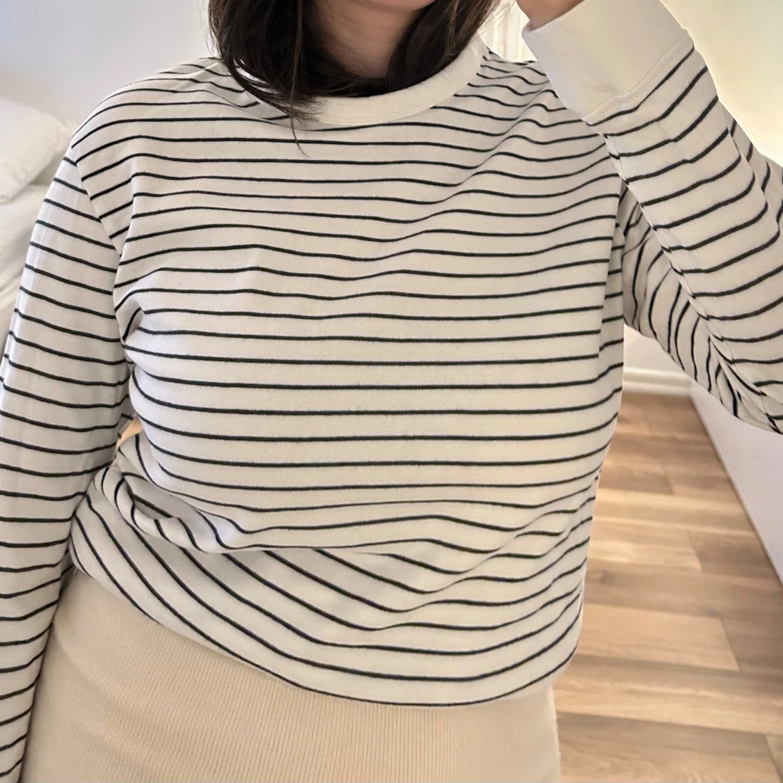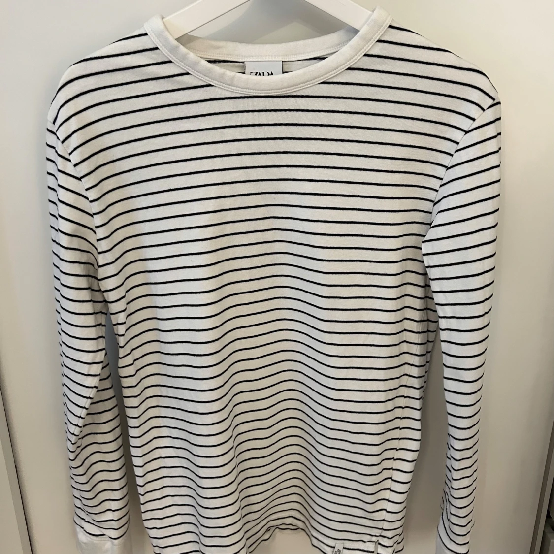 Säljer en klassisk vit långärmad tröja från Zara med tunna svarta horisontella ränder. Tröjan har rund halsringning.