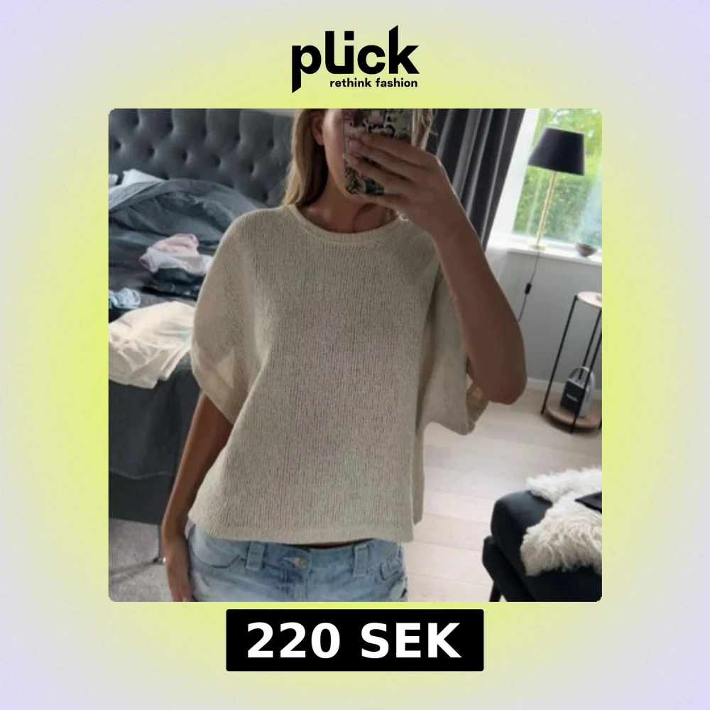 Säljer en beige stickad tröja med lös passform och korta ärmar. Tröjan har en enkel, stilren design med rund halsringning och är perfekt för dig som gillar en avslappnad och trendig look.